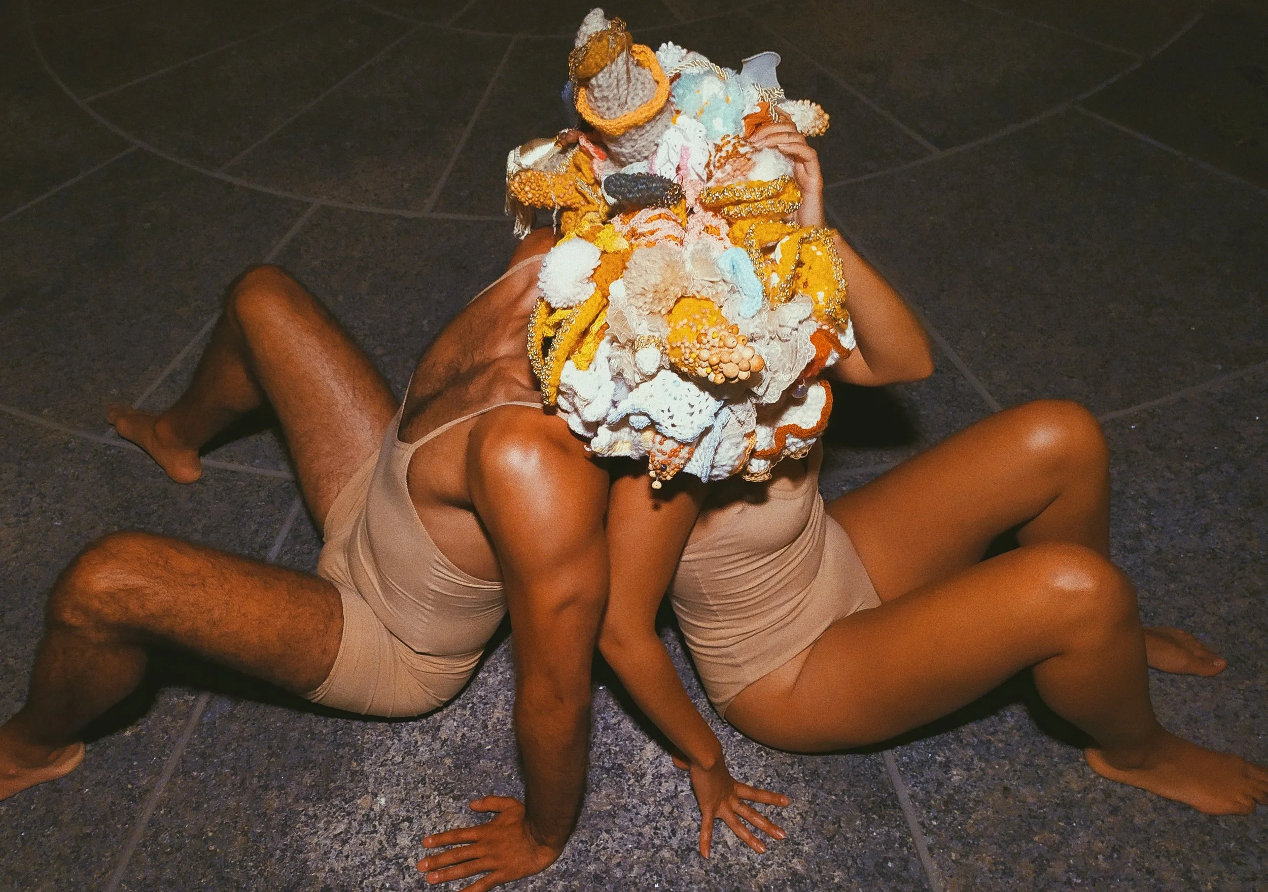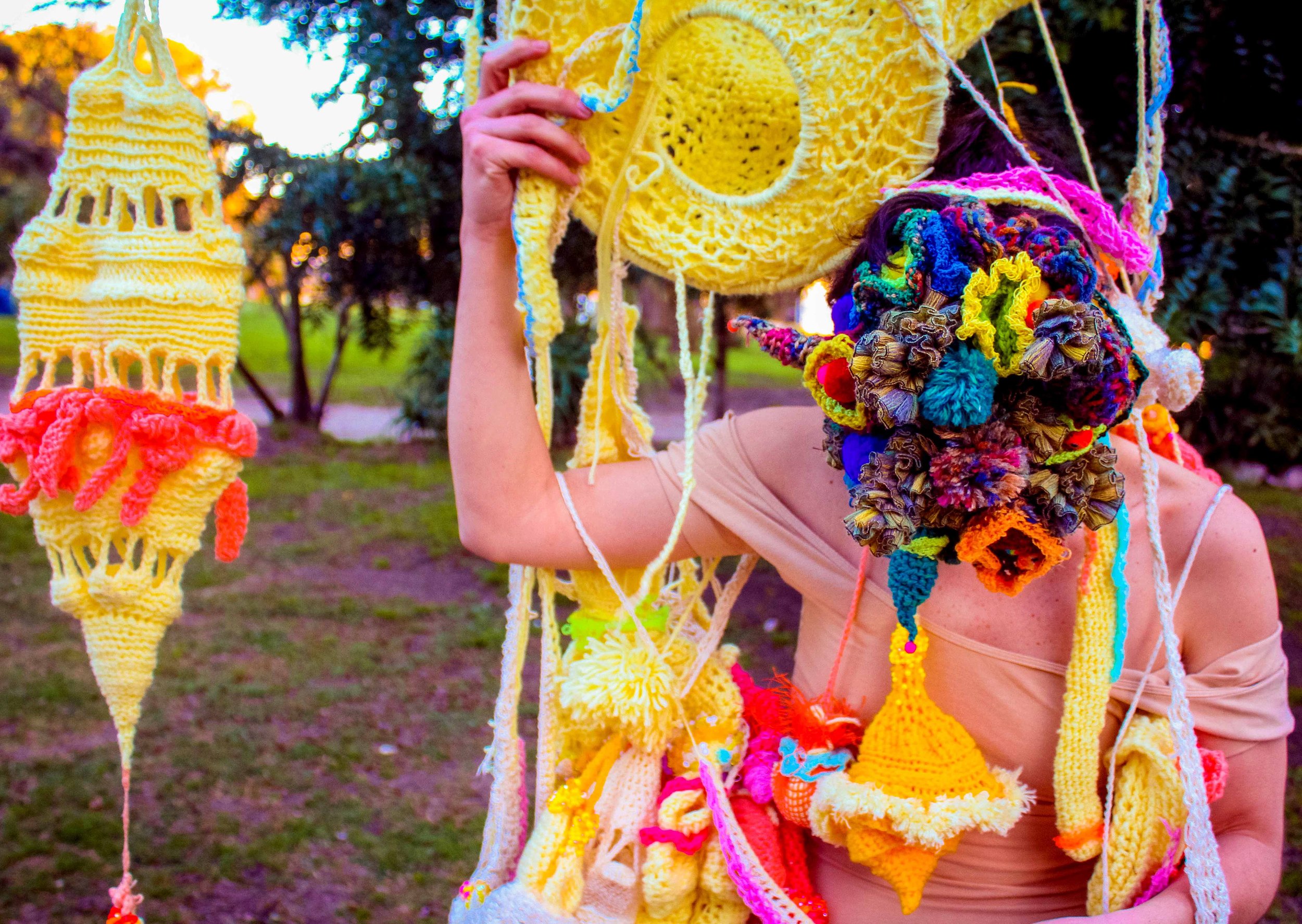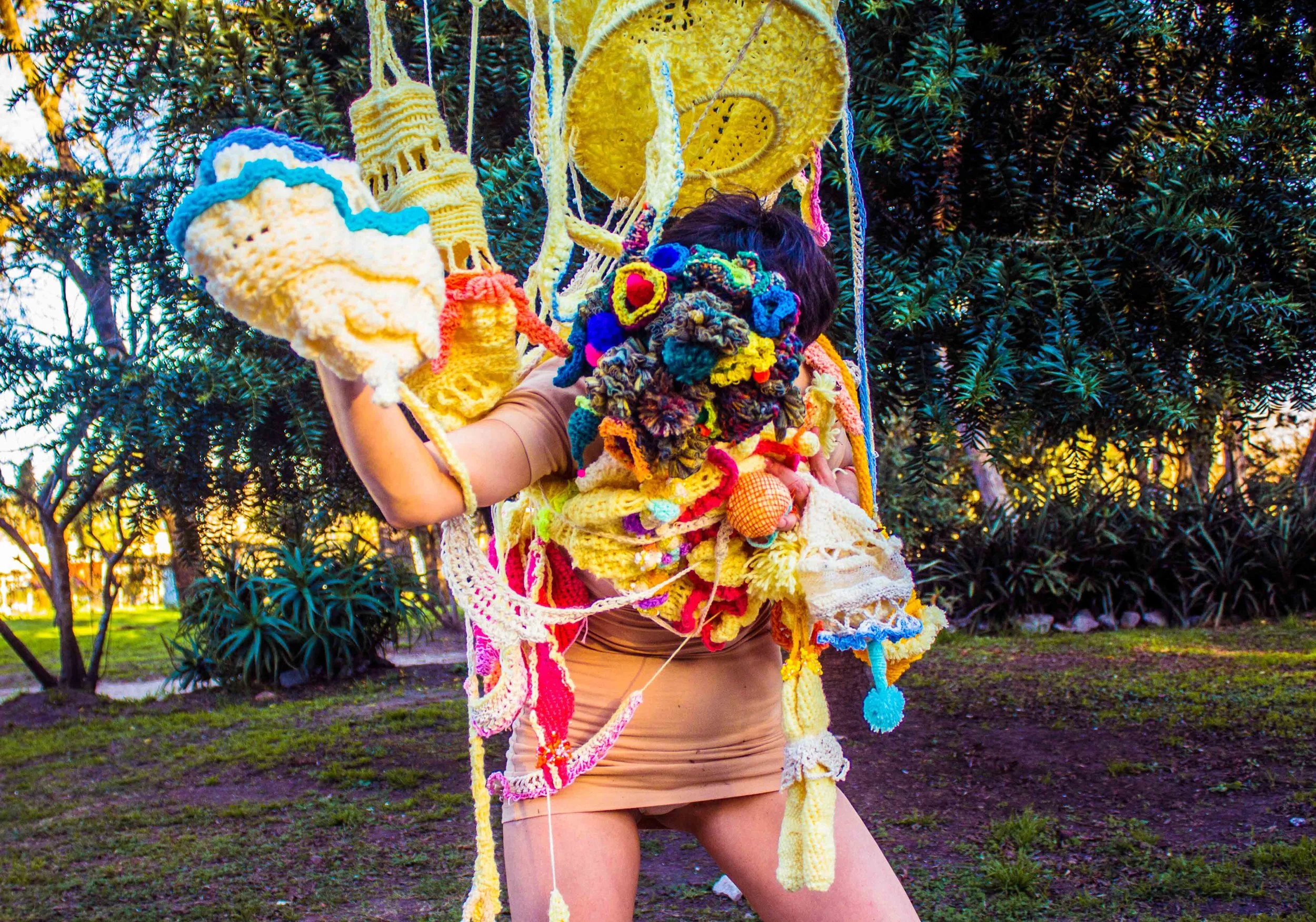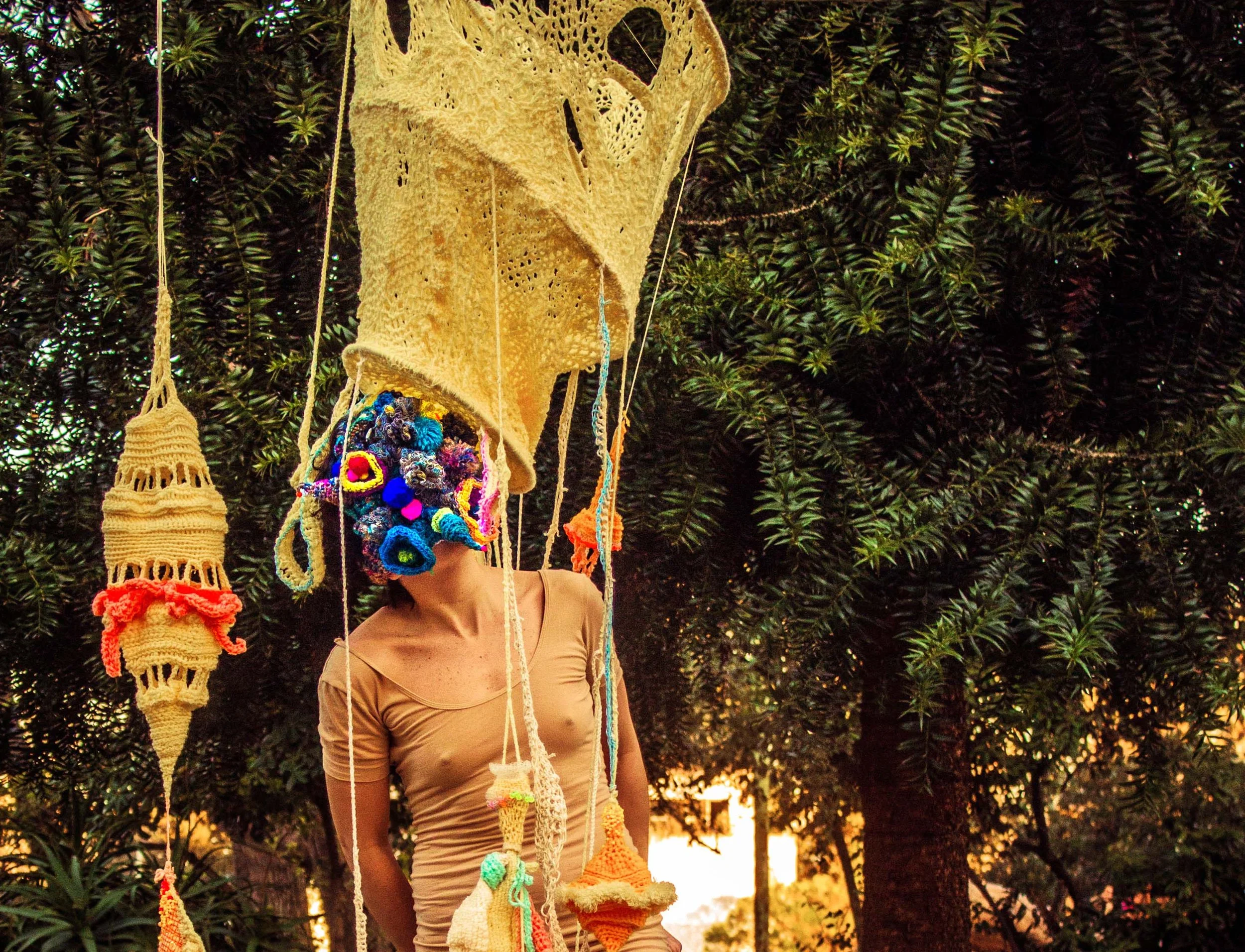 These wearable sculptures were made with crochet, embroidery, knitting and beading techniques to create amorphous, unidentifiable bodies. They obstruct vision and enhance tactility, compelling performers to engage with their surroundings through alternative sensory modes. In doing so, they are invited to rely on play and improvisation to navigate space. Rather than thinking/rational beings, they become playing beings—Homx Ludens. Their movements, in relation to the site and the reactions of passersby, generate a surreal image that unfolds in real time. This encounter reveals how perception, embodiment, and public space are continuously reshaped through shifting interactions. The masks have been worn by different individuals, giving rise to diverse embodiments of the same forms.
