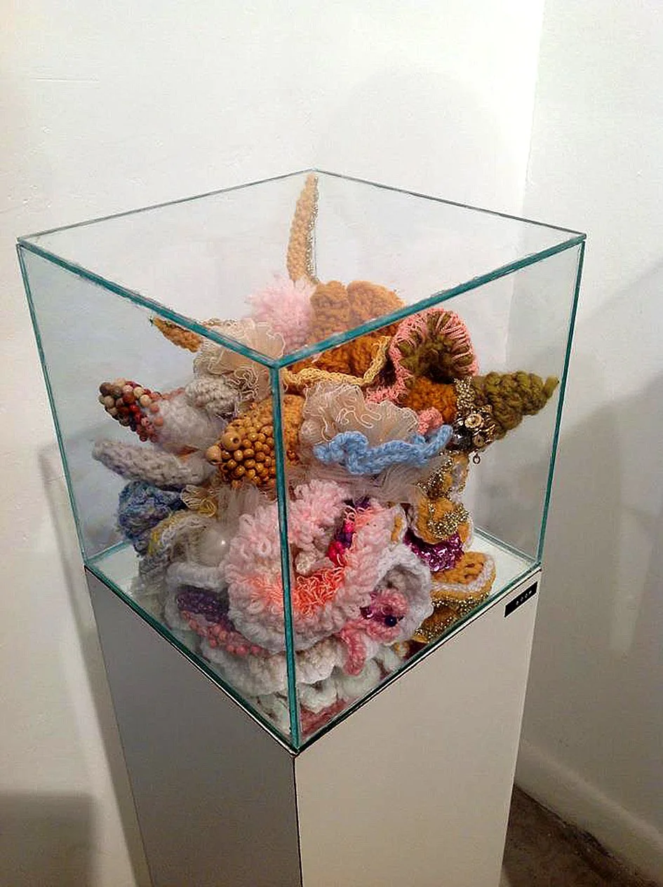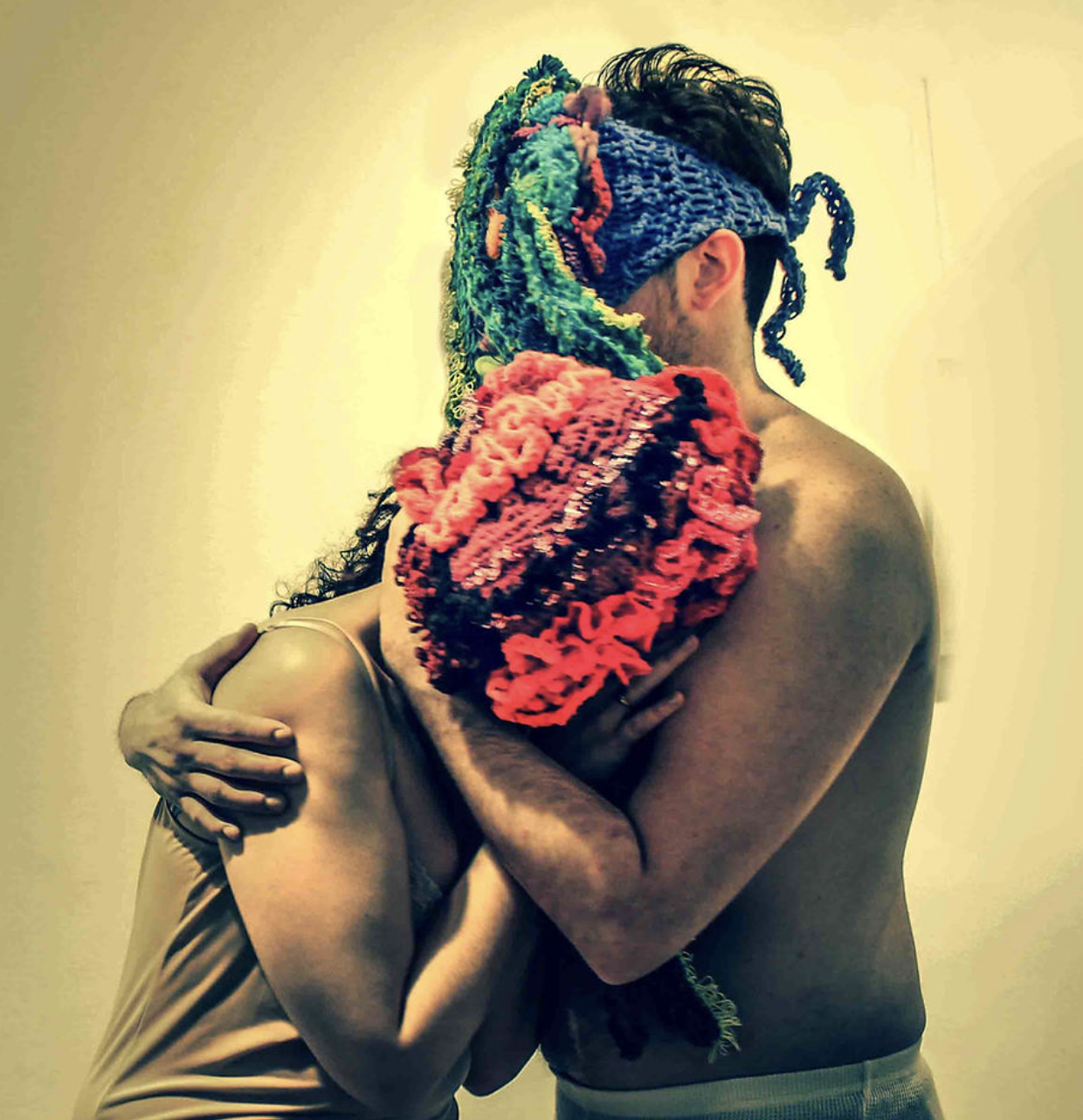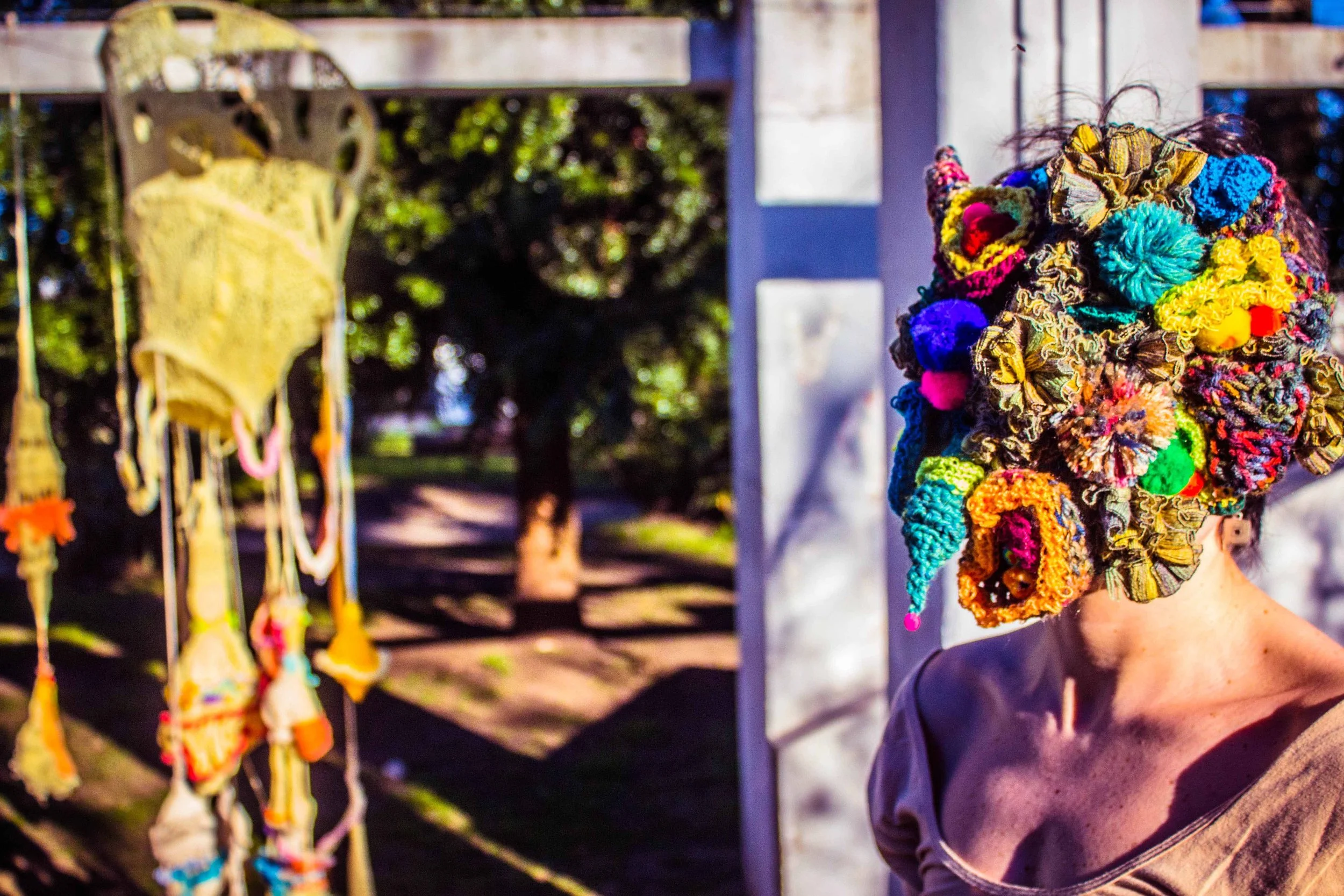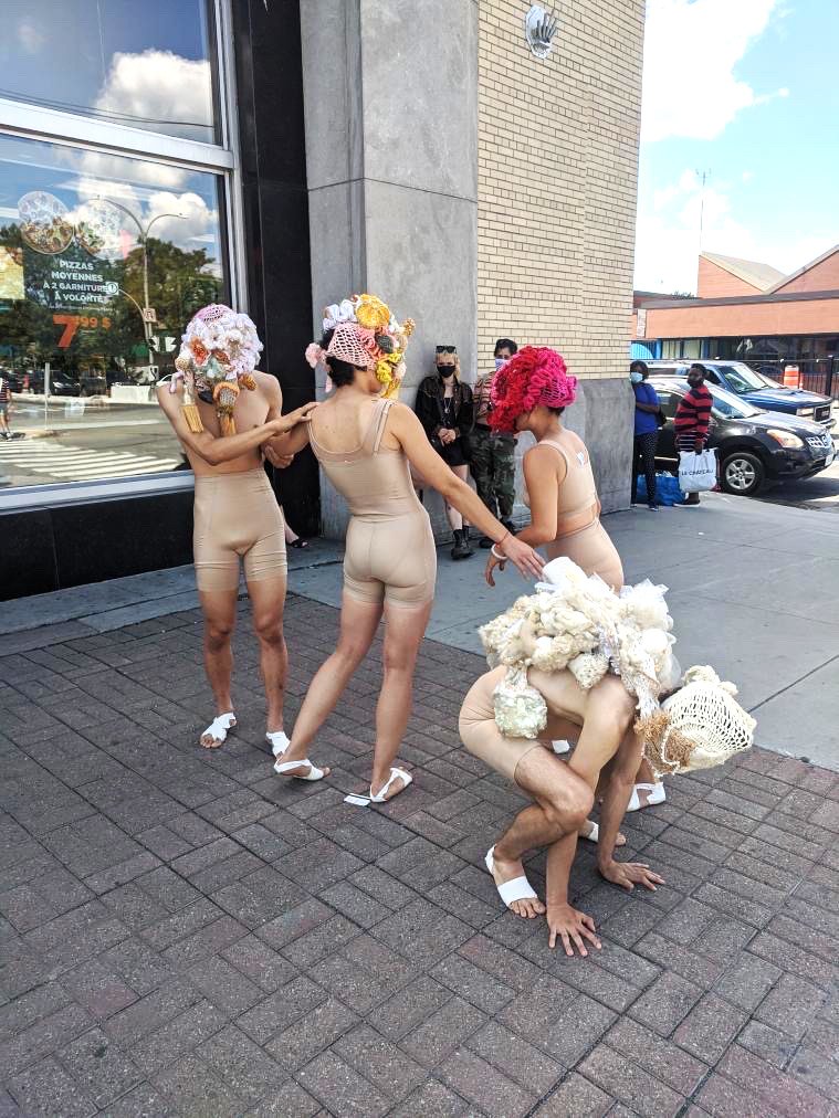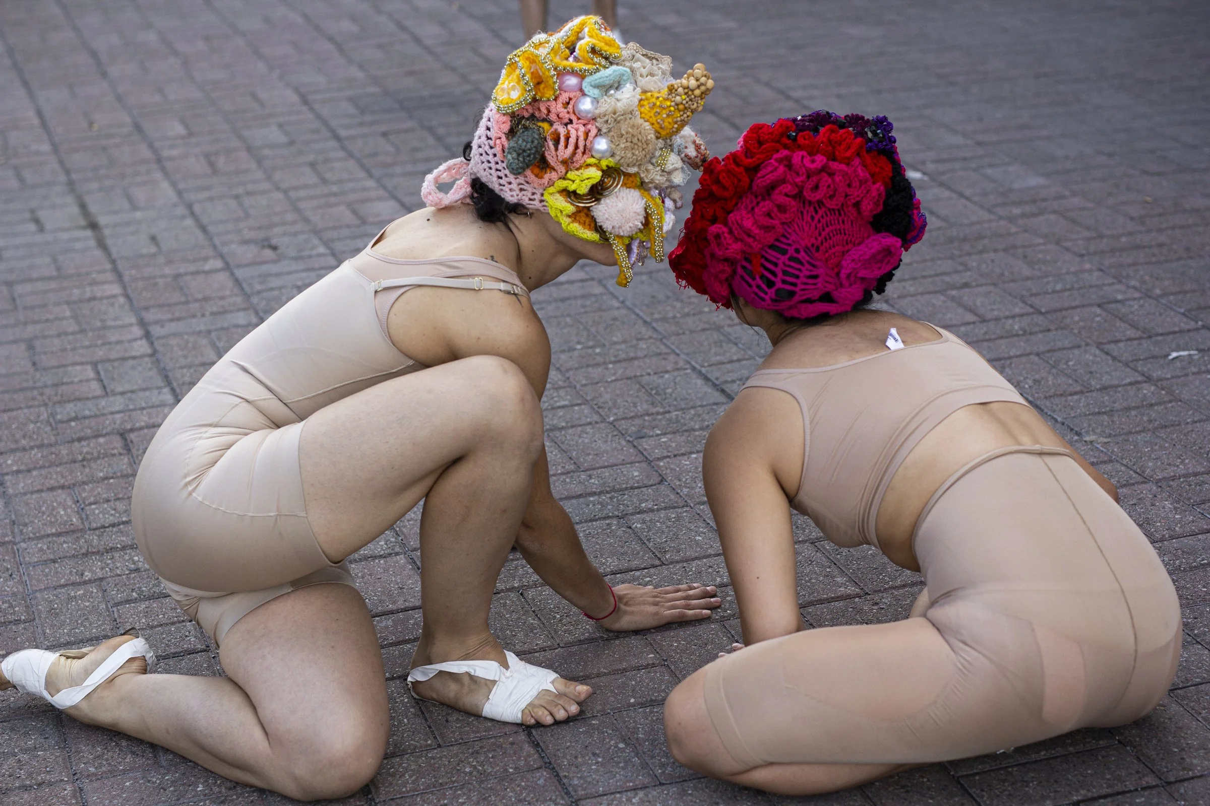 These wearable sculptures were made with crochet, embroidery, knitting and beading techniques to create amorphous, unidentifiable bodies. They obstruct vision and enhance tactility, compelling performers to engage with their surroundings through alternative sensory modes. In doing so, they are invited to rely on play and improvisation to navigate space. Rather than thinking/rational beings, they become playing beings—Homx Ludens. Their movements, in relation to the site and the reactions of passersby, generate a surreal image that unfolds in real time. This encounter reveals how perception, embodiment, and public space are continuously reshaped through shifting interactions. The masks have been worn by different individuals, giving rise to diverse embodiments of the same forms.