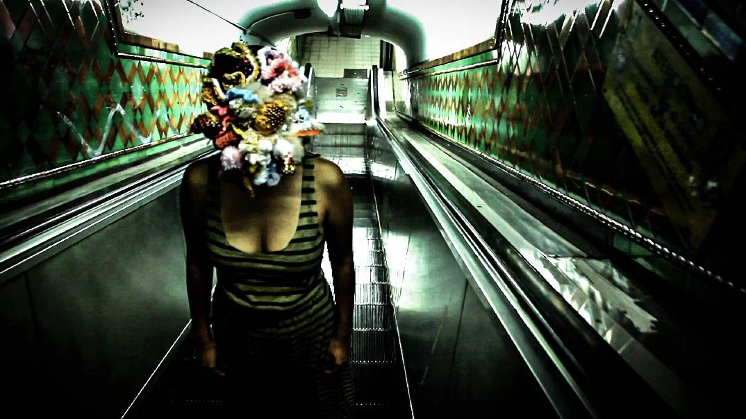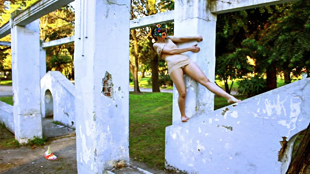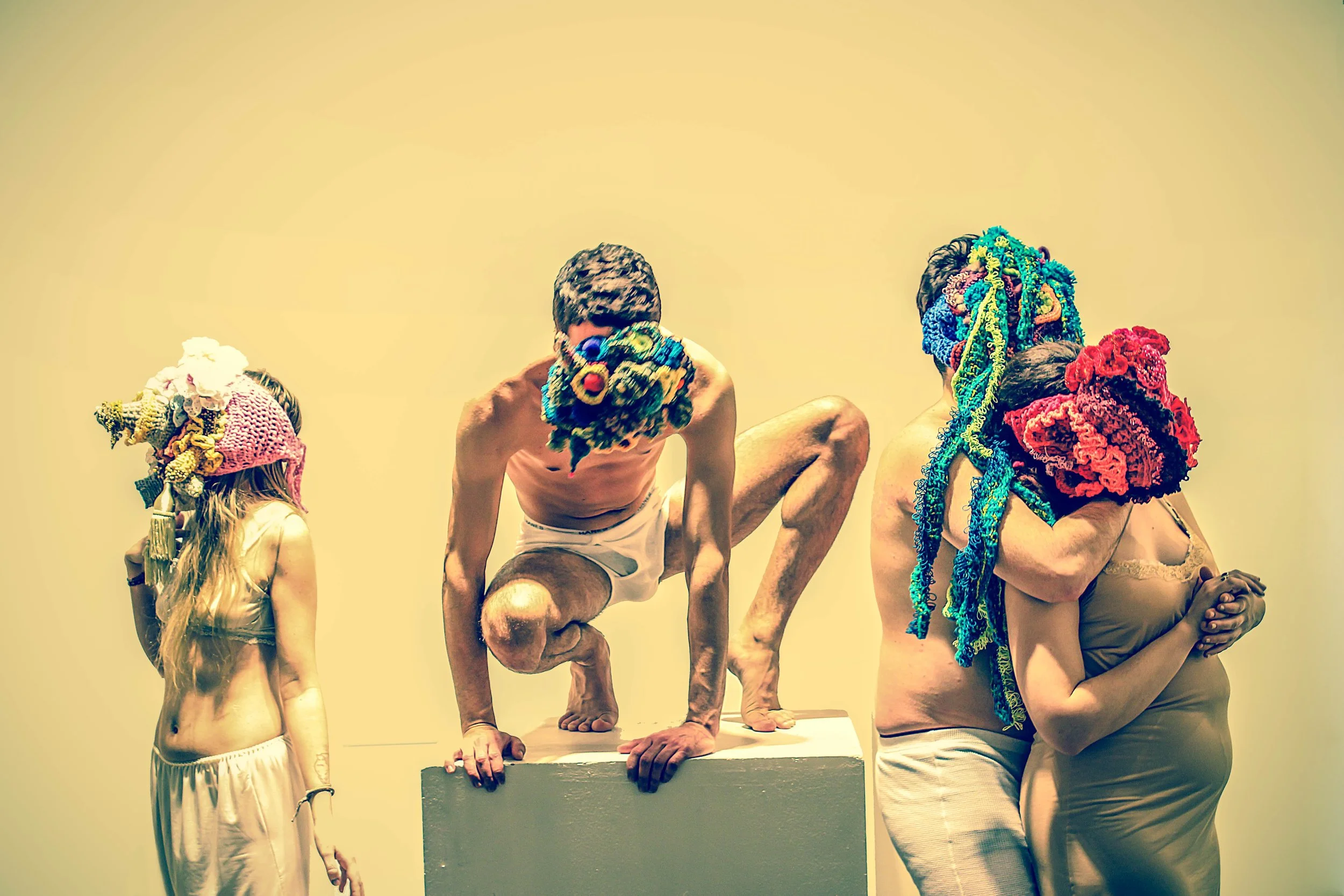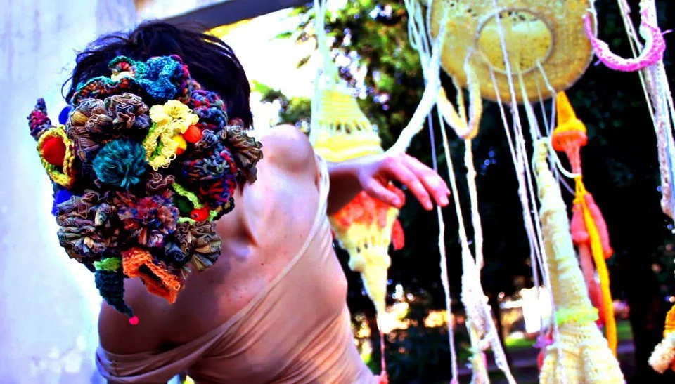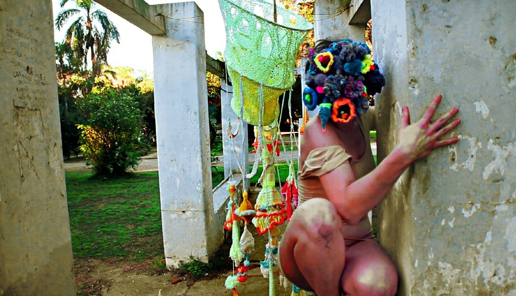This series of street interventions was performed across various public sites in South and North America. They consist of absurdist movement scores enacted with wearable textile sculptures, transforming pedestrian spaces into sites of virtual possibility where normative relationships between body and space can be reimagined and new narratives can emerge. Some of the performances were documented and now exist as a photography series and the masks as sculptures.