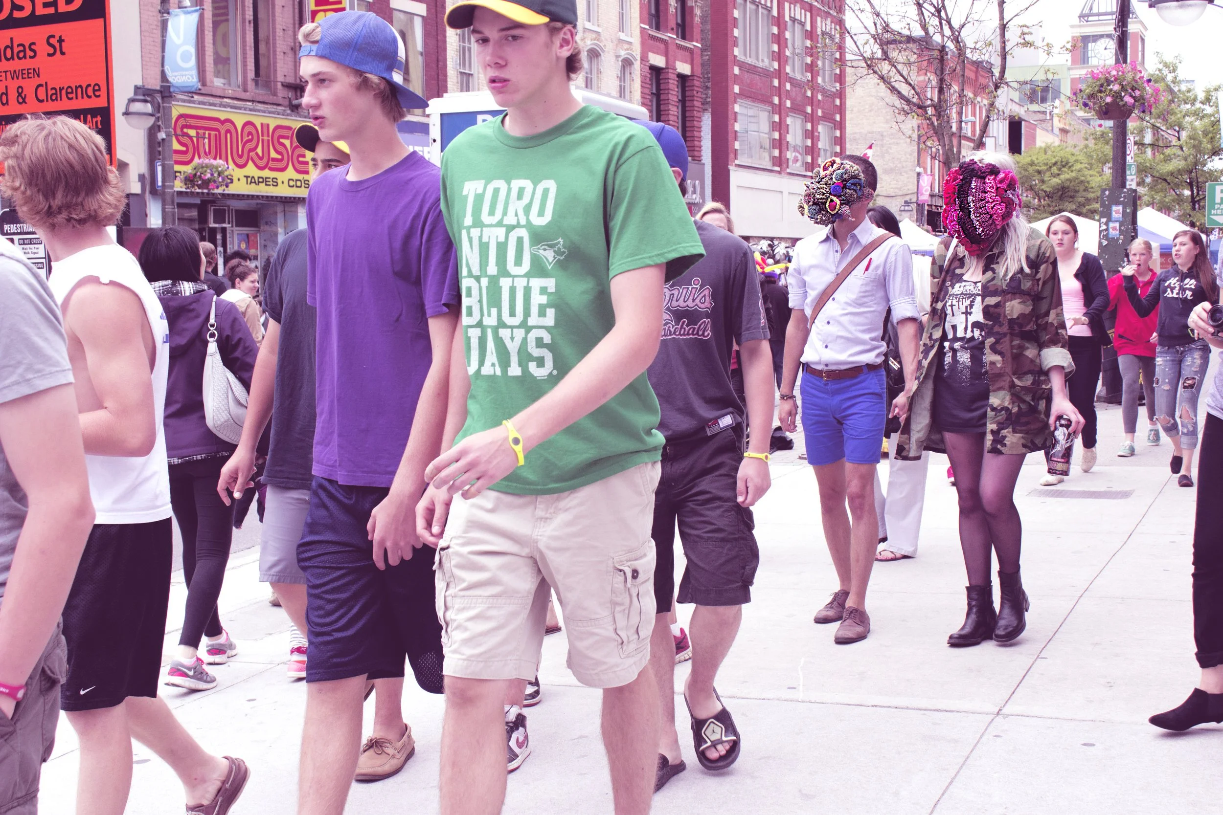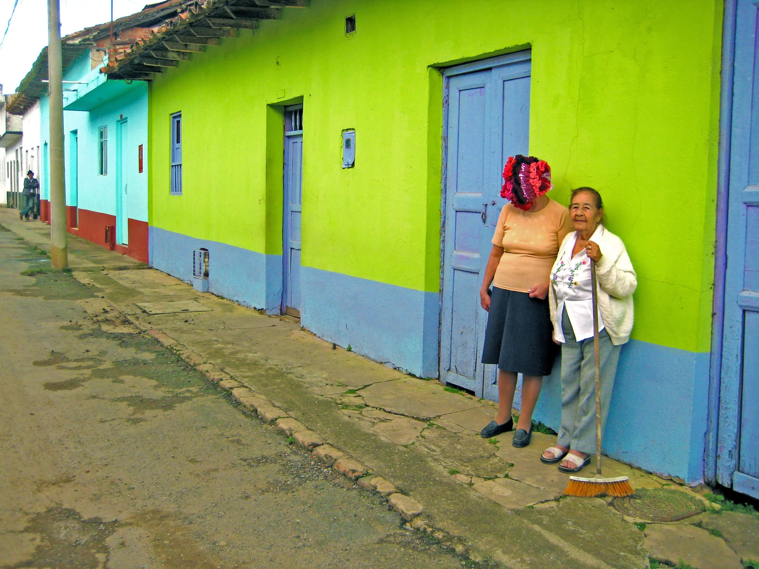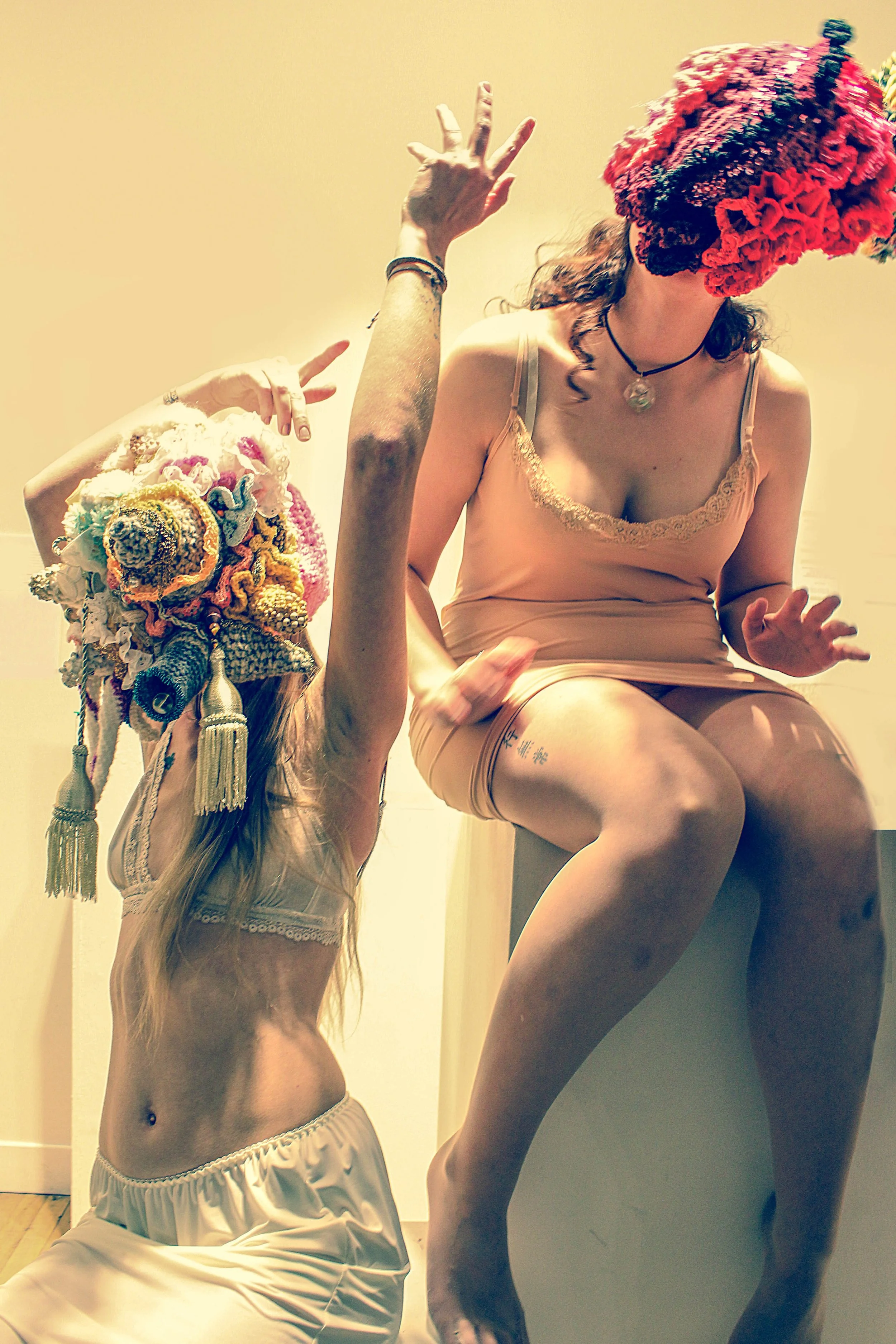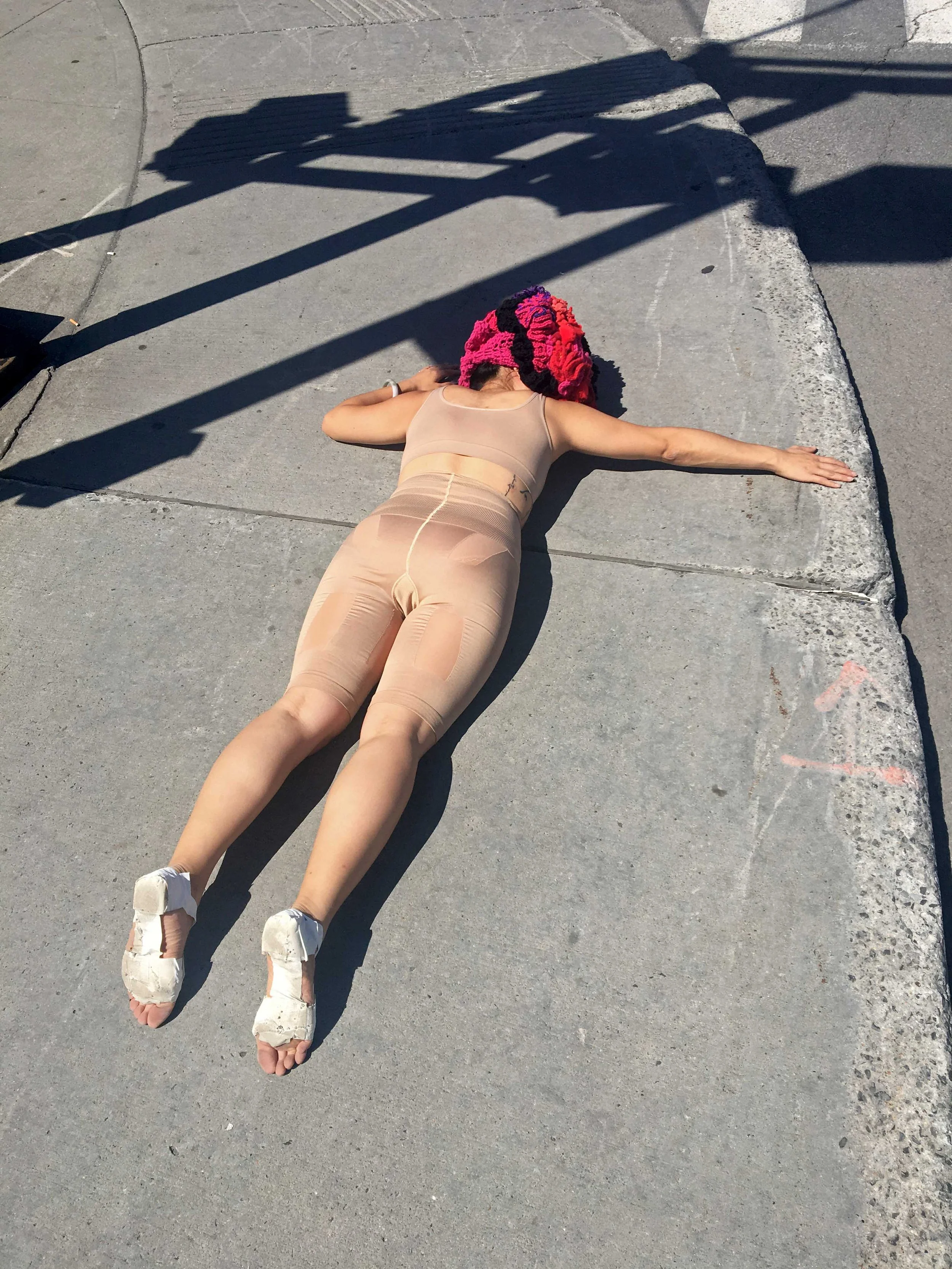 This series of street interventions was performed across various public sites in South and North America. They consist of absurdist movement scores enacted with wearable textile sculptures, transforming pedestrian spaces into sites of virtual possibility where normative relationships between body and space can be reimagined and new narratives can emerge. Some of the performances were documented and now exist as a photography series and the masks as sculptures.
