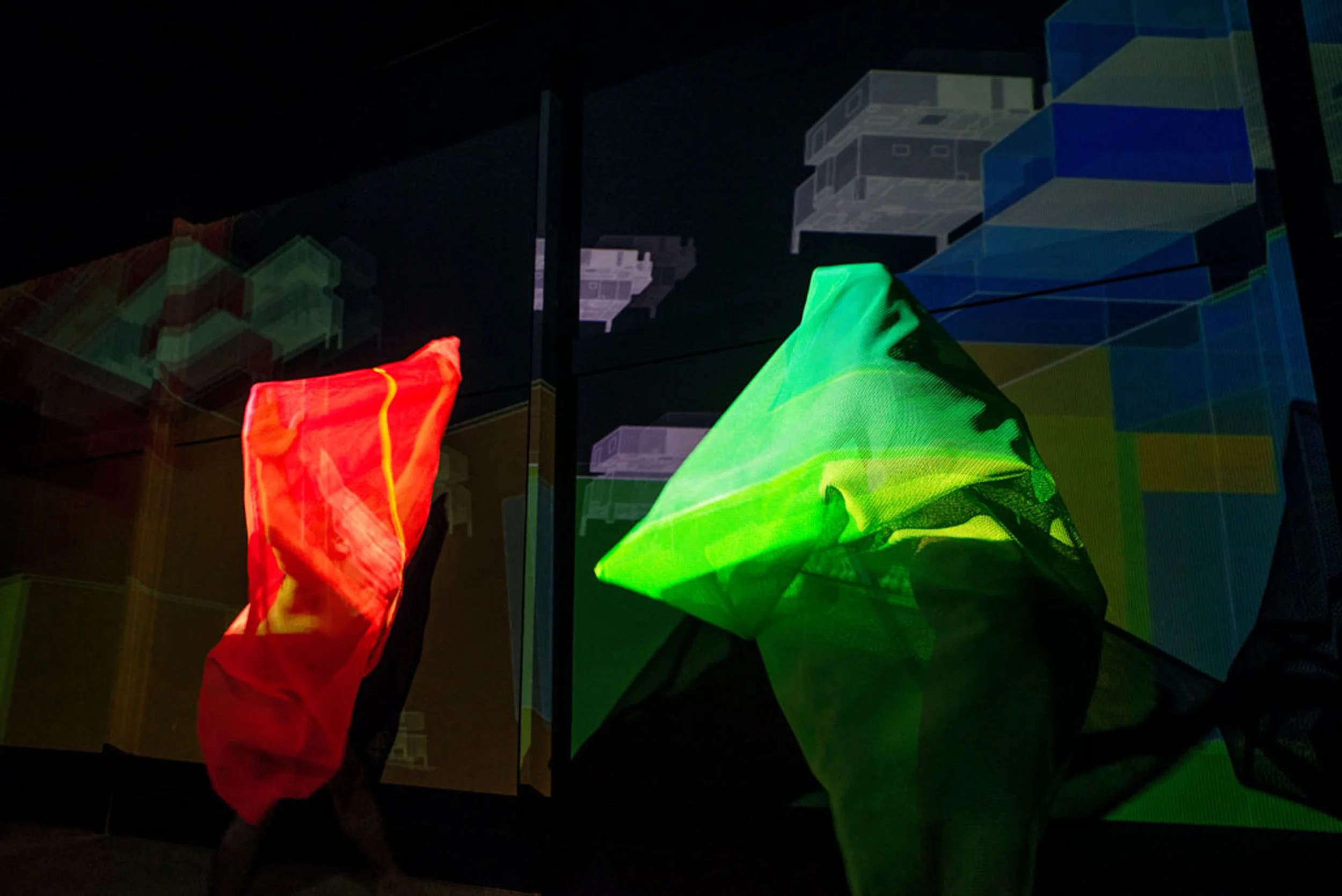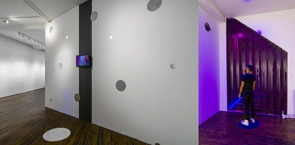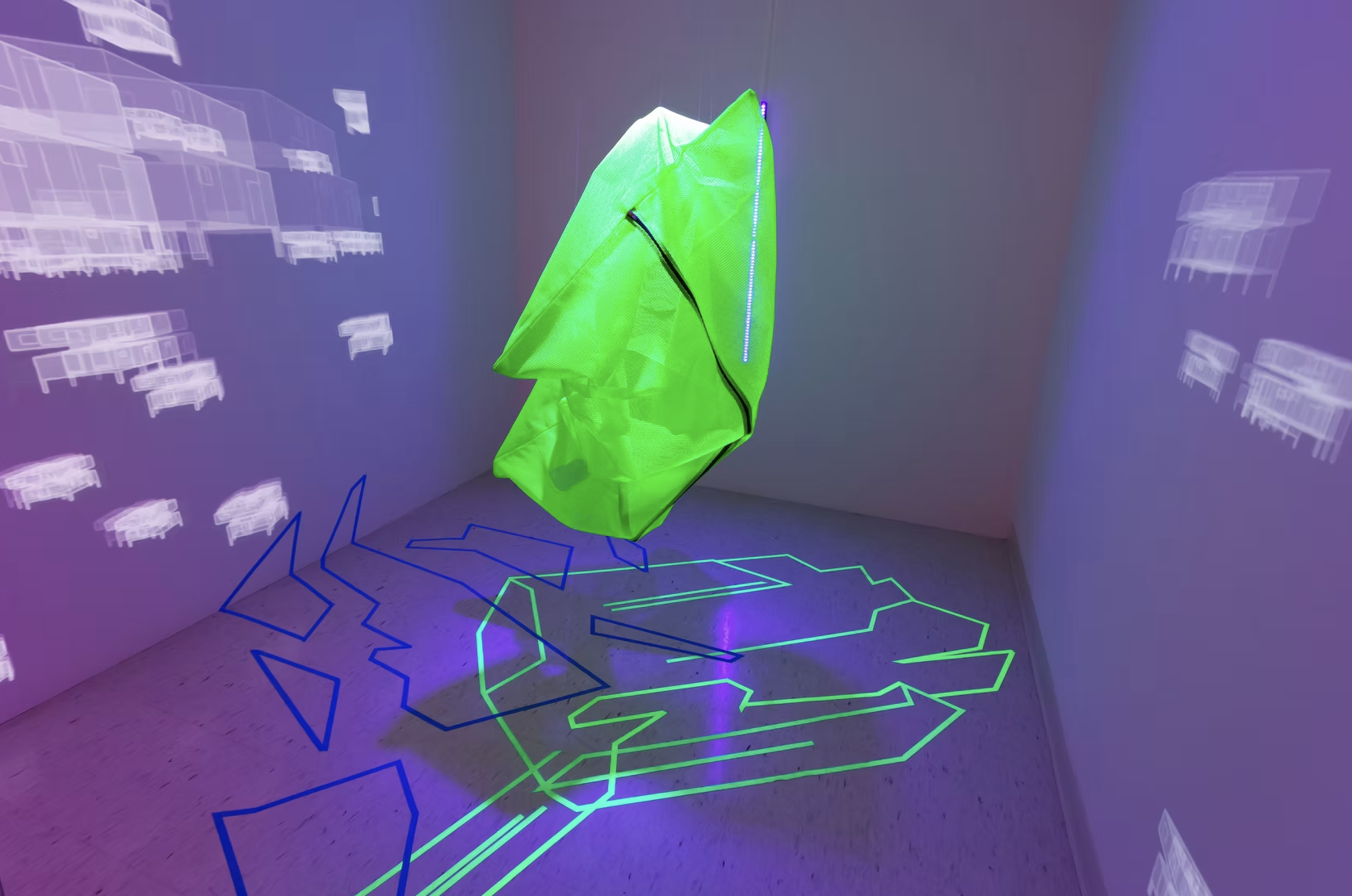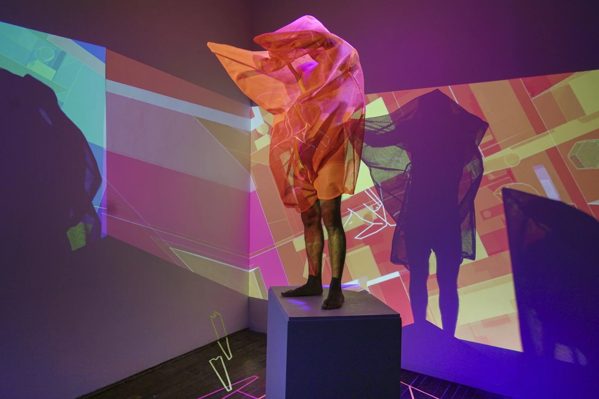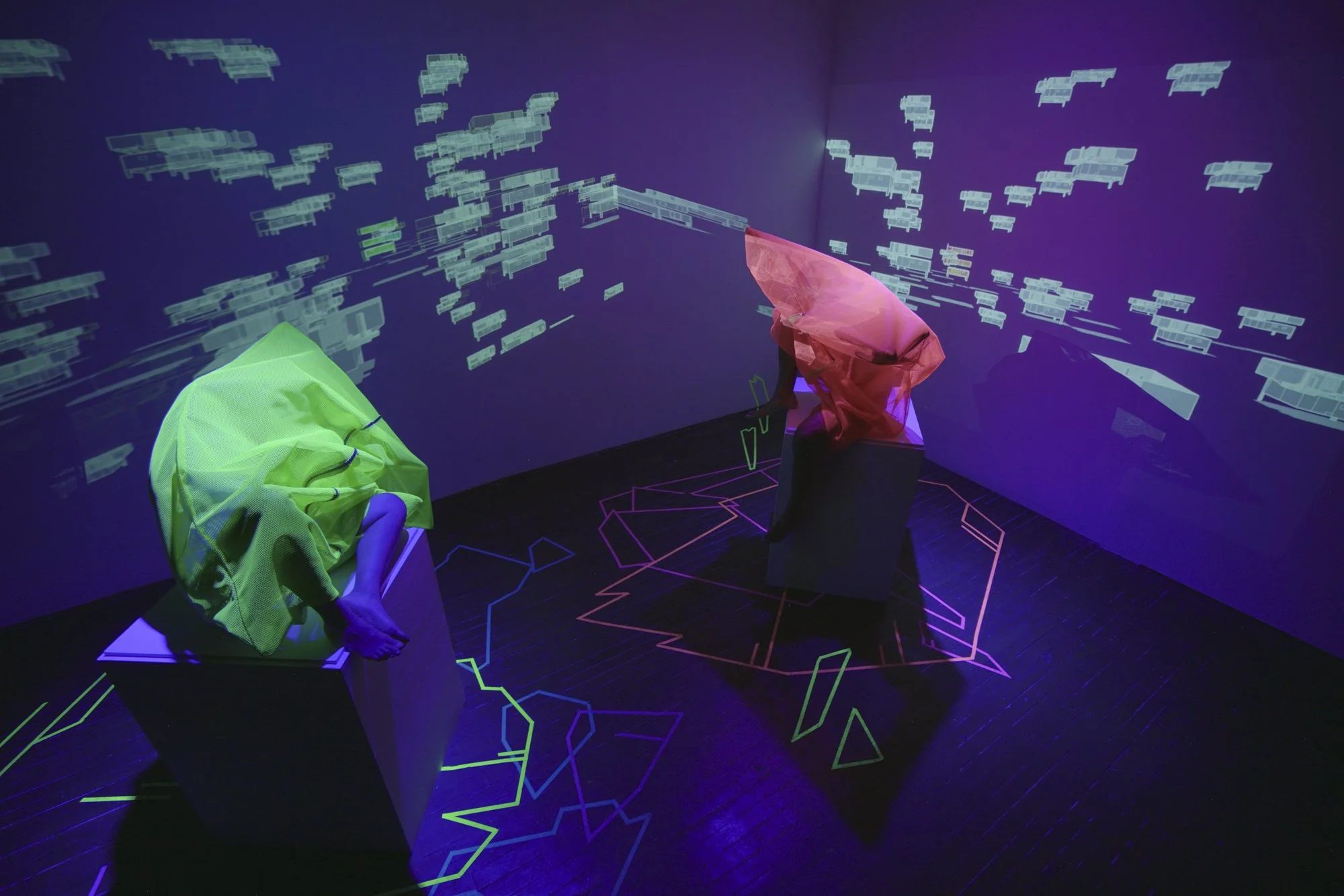 This installation is an ecosystem of large video projections, spatialized soundscapes, live camera feeds, light compositions and 3D animations based on data analysis captured from a performance with a light reflective textile. The performer wearing the textile, or the textile hanging as a sculpture, is placed inside a sealed room in the middle of the gallery and is never seen directly, yet their presence takes over the entire space through various digital traces. Through this, the work invites the audience to question how those bodies who are deemed invisible and excluded in society still have immense influence over the environments we all share. This work places the audience in a threshold between body and space, where lack of visibility does not erase presence.