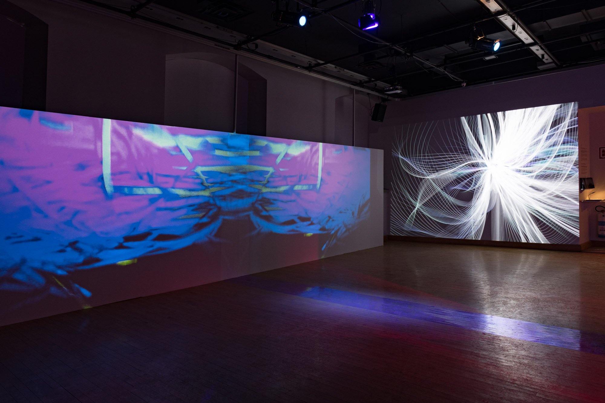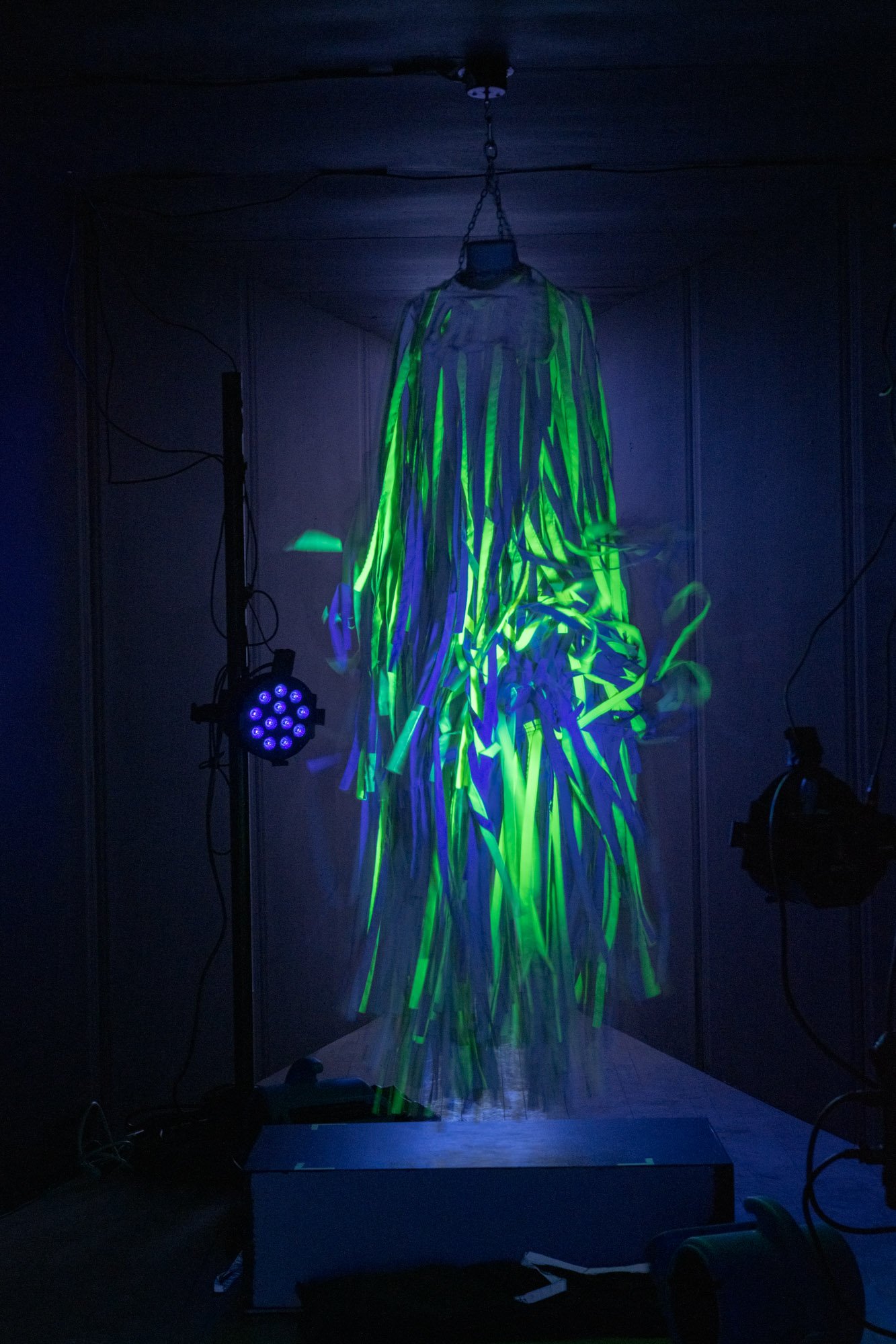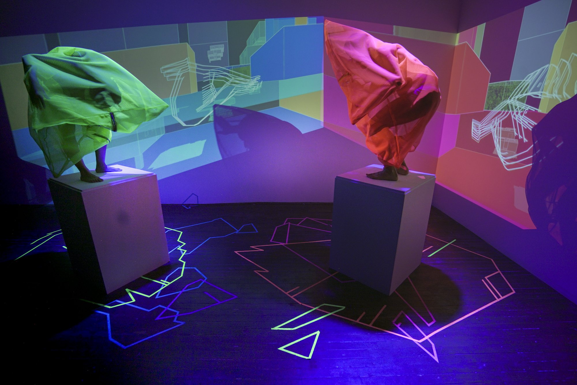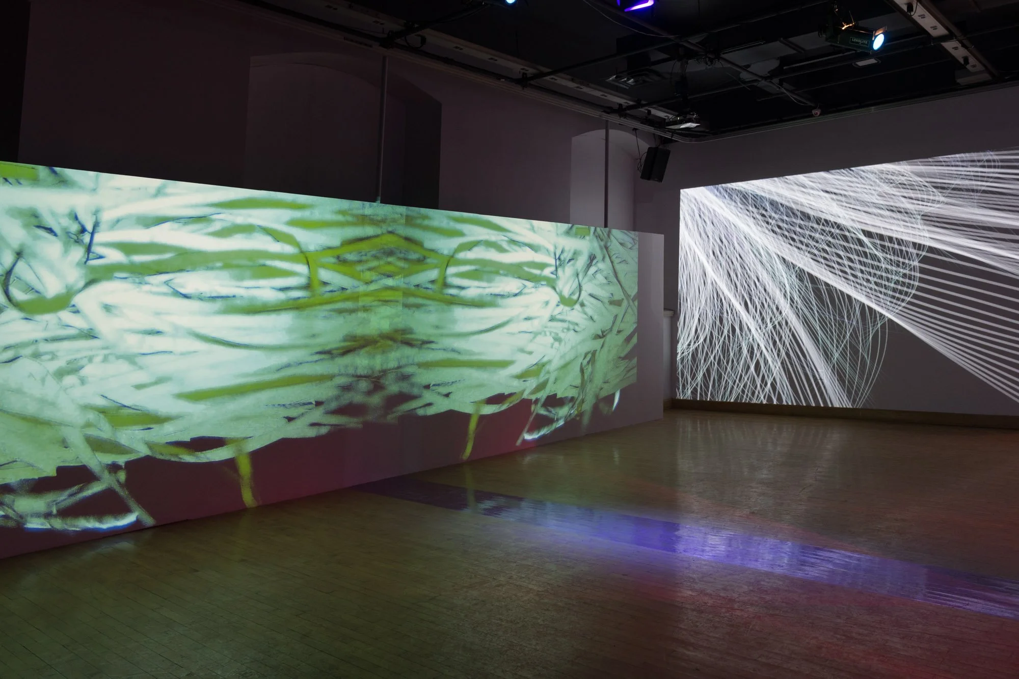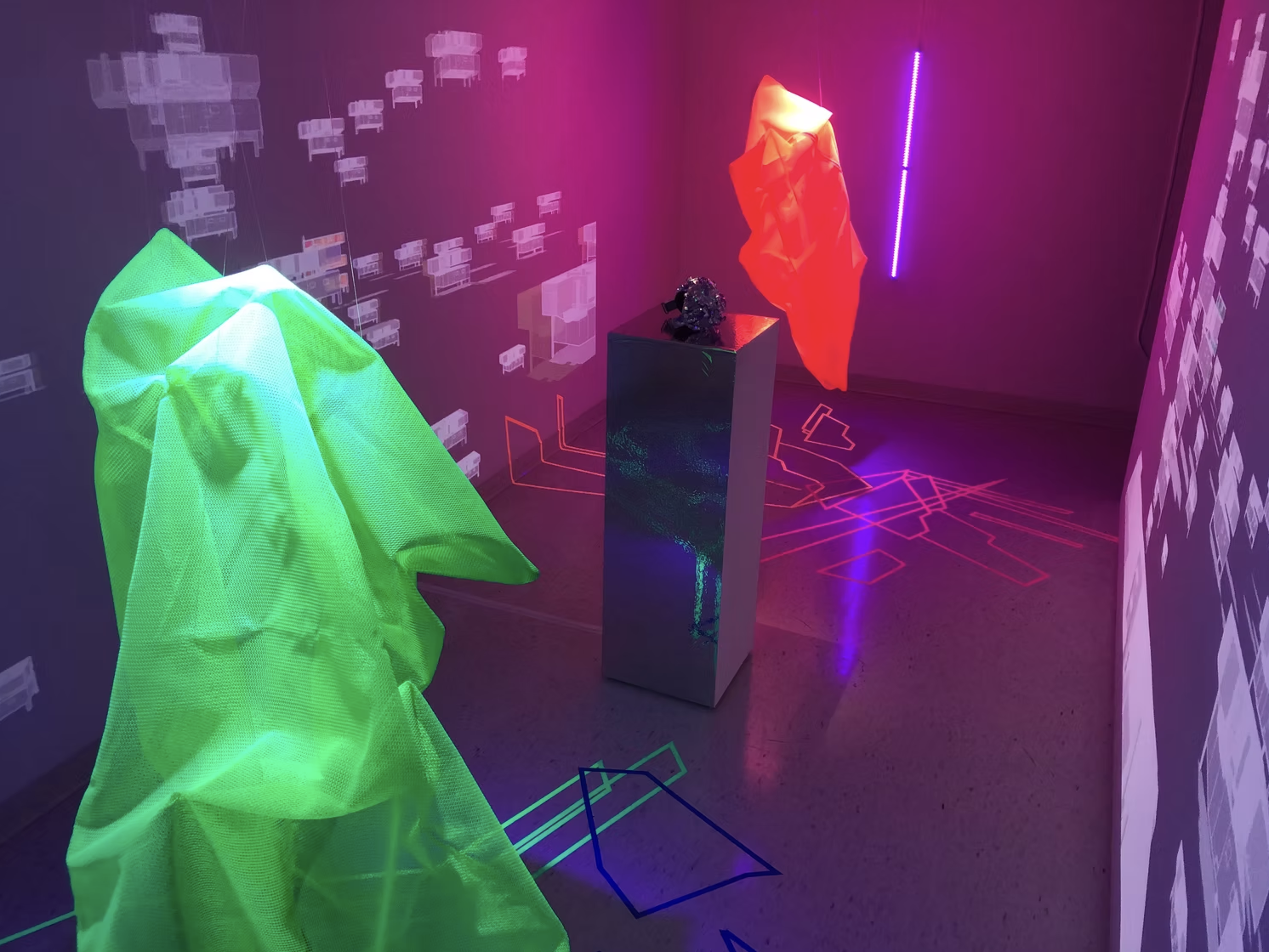 This installation is an ecosystem of large video projections, spatialized soundscapes, live camera feeds, light compositions and 3D animations based on data analysis captured from a performance with a light reflective textile. The performer wearing the textile, or the textile hanging as a sculpture, is placed inside a sealed room in the middle of the gallery and is never seen directly, yet their presence takes over the entire space through various digital traces. Through this, the work invites the audience to question how those bodies who are deemed invisible and excluded in society still have immense influence over the environments we all share. This work places the audience in a threshold between body and space, where lack of visibility does not erase presence.