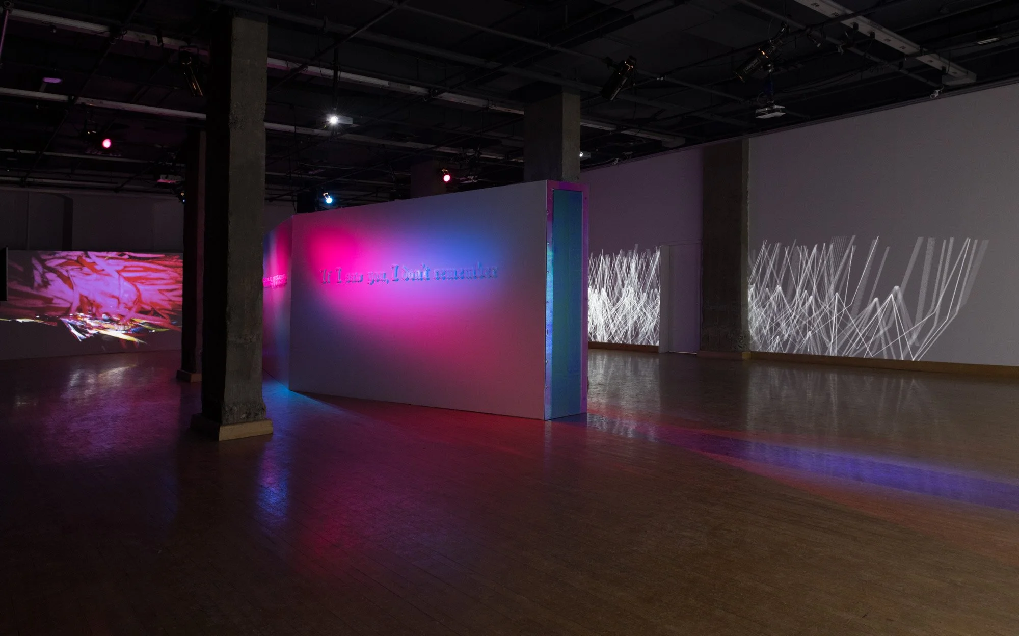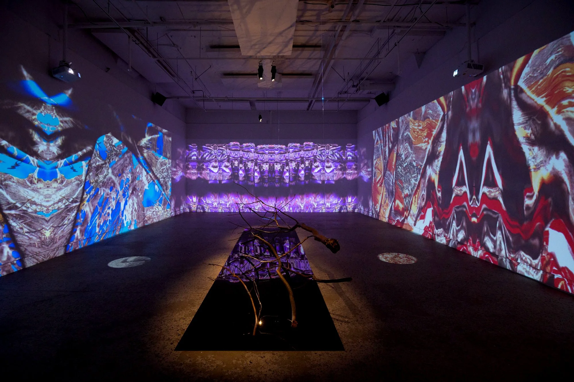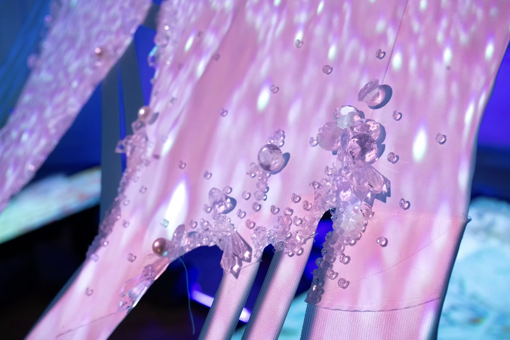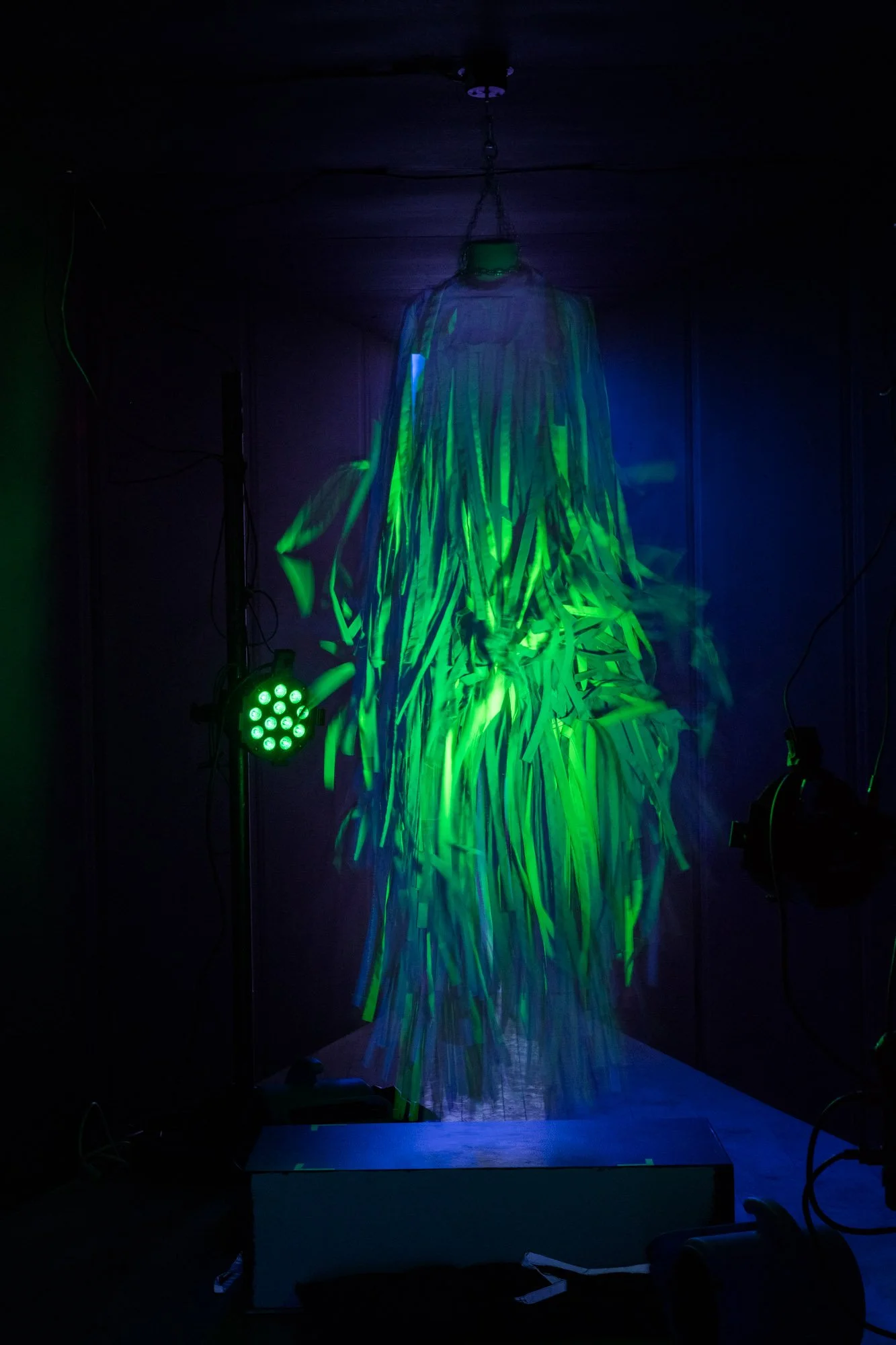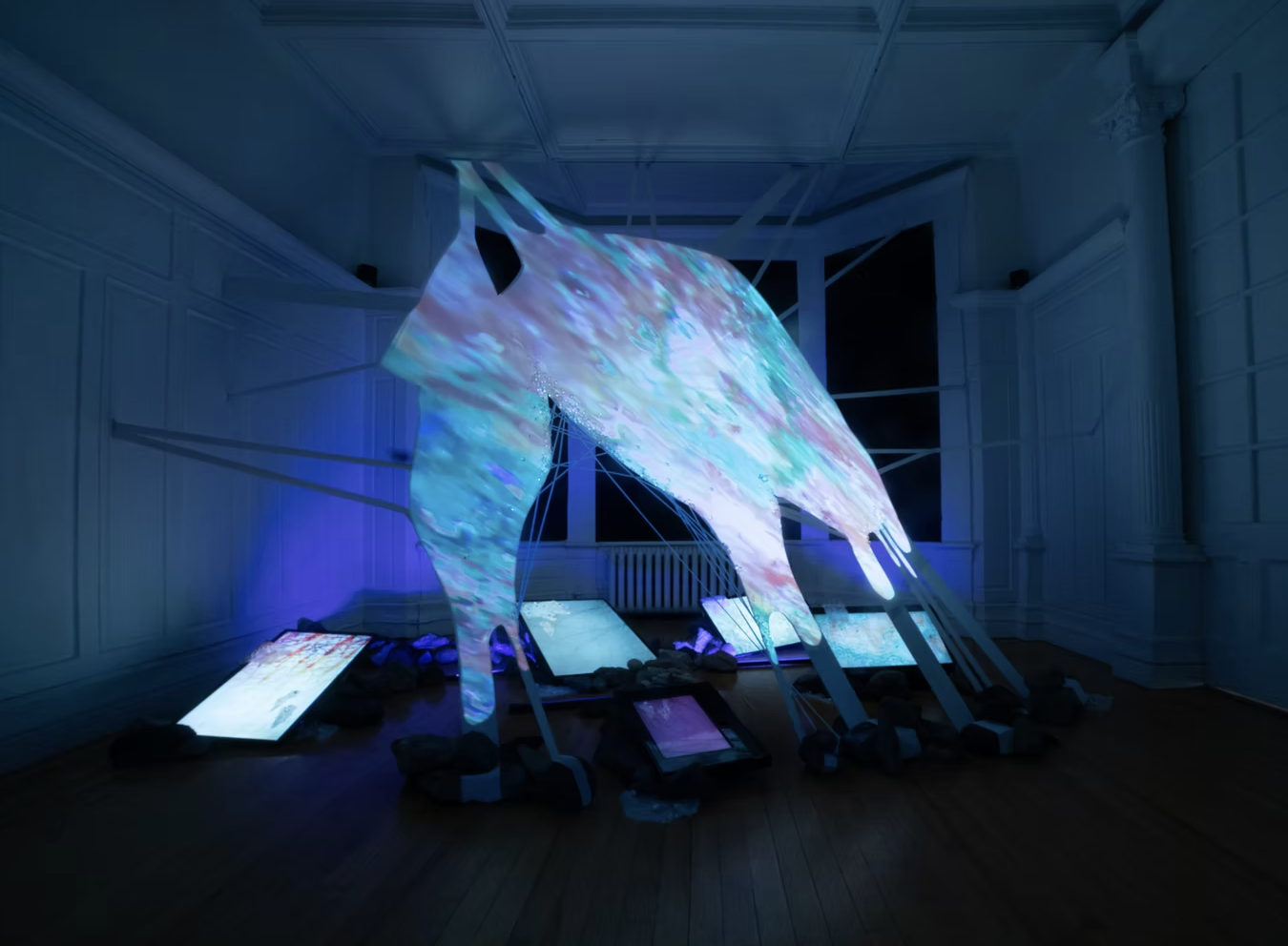 This installation is an ecosystem of large video projections, spatialized soundscapes, live camera feeds, light compositions and 3D animations based on data analysis captured from a performance with a light reflective textile. The performer wearing the textile, or the textile hanging as a sculpture, is placed inside a sealed room in the middle of the gallery and is never seen directly, yet their presence takes over the entire space through various digital traces. Through this, the work invites the audience to question how those bodies who are deemed invisible and excluded in society still have immense influence over the environments we all share. This work places the audience in a threshold between body and space, where lack of visibility does not erase presence.