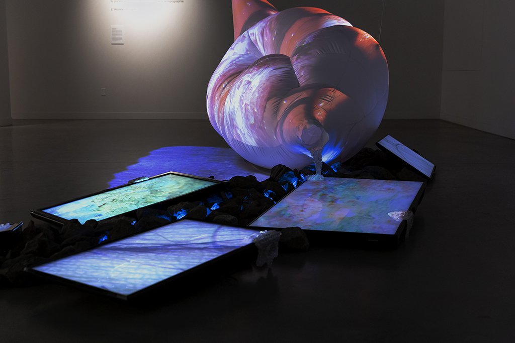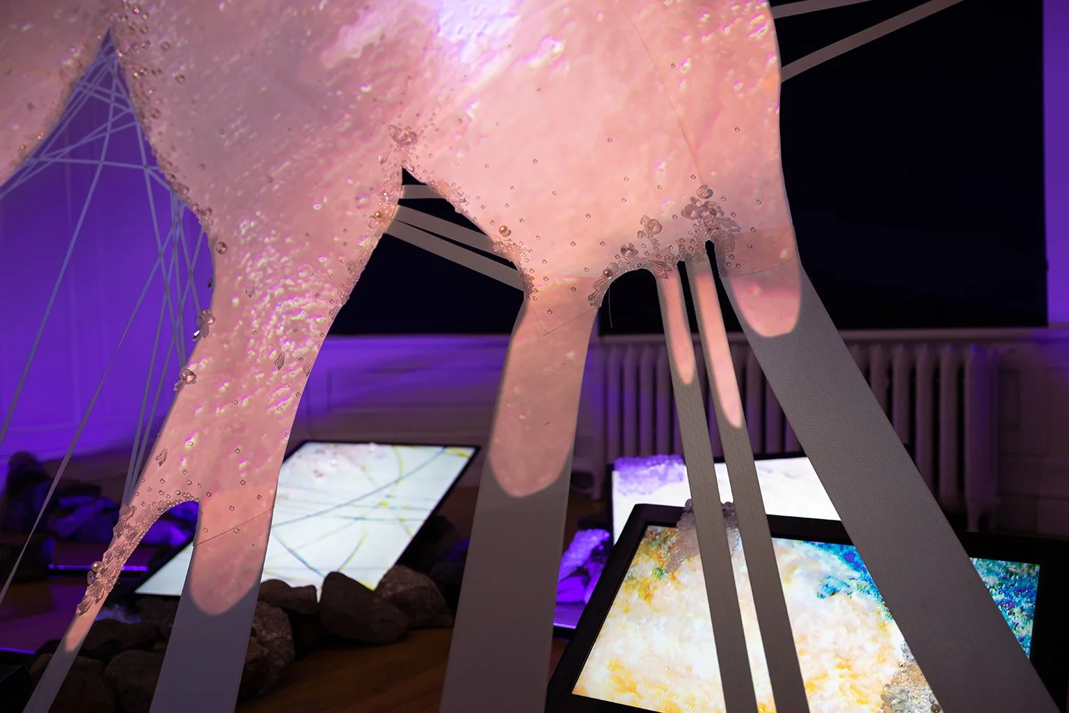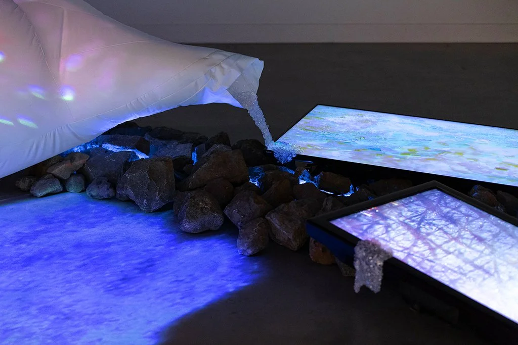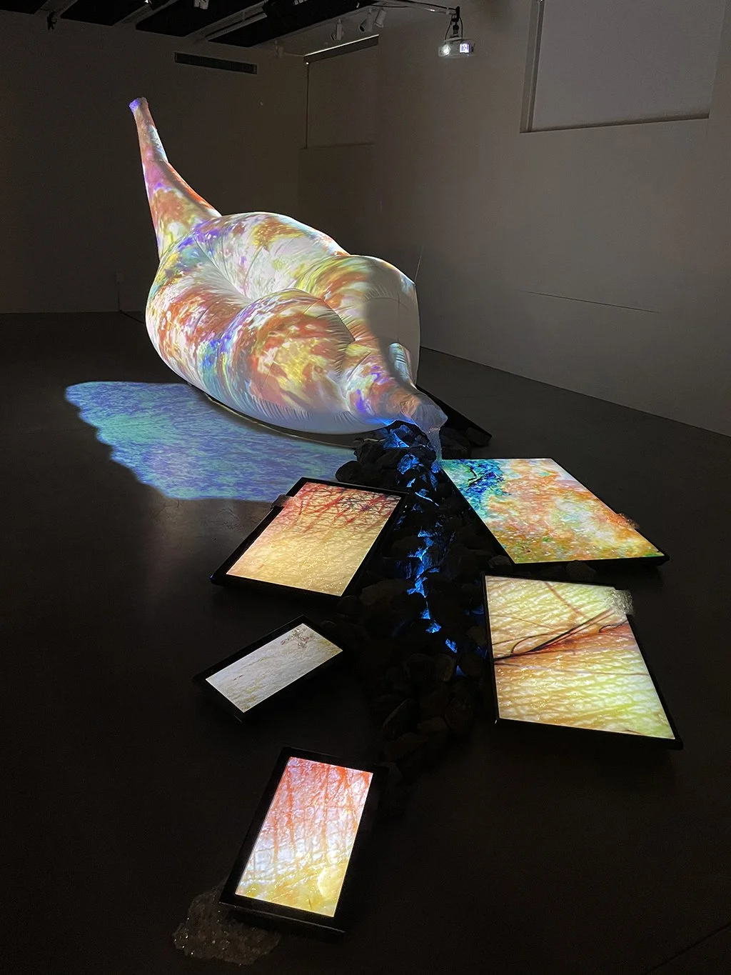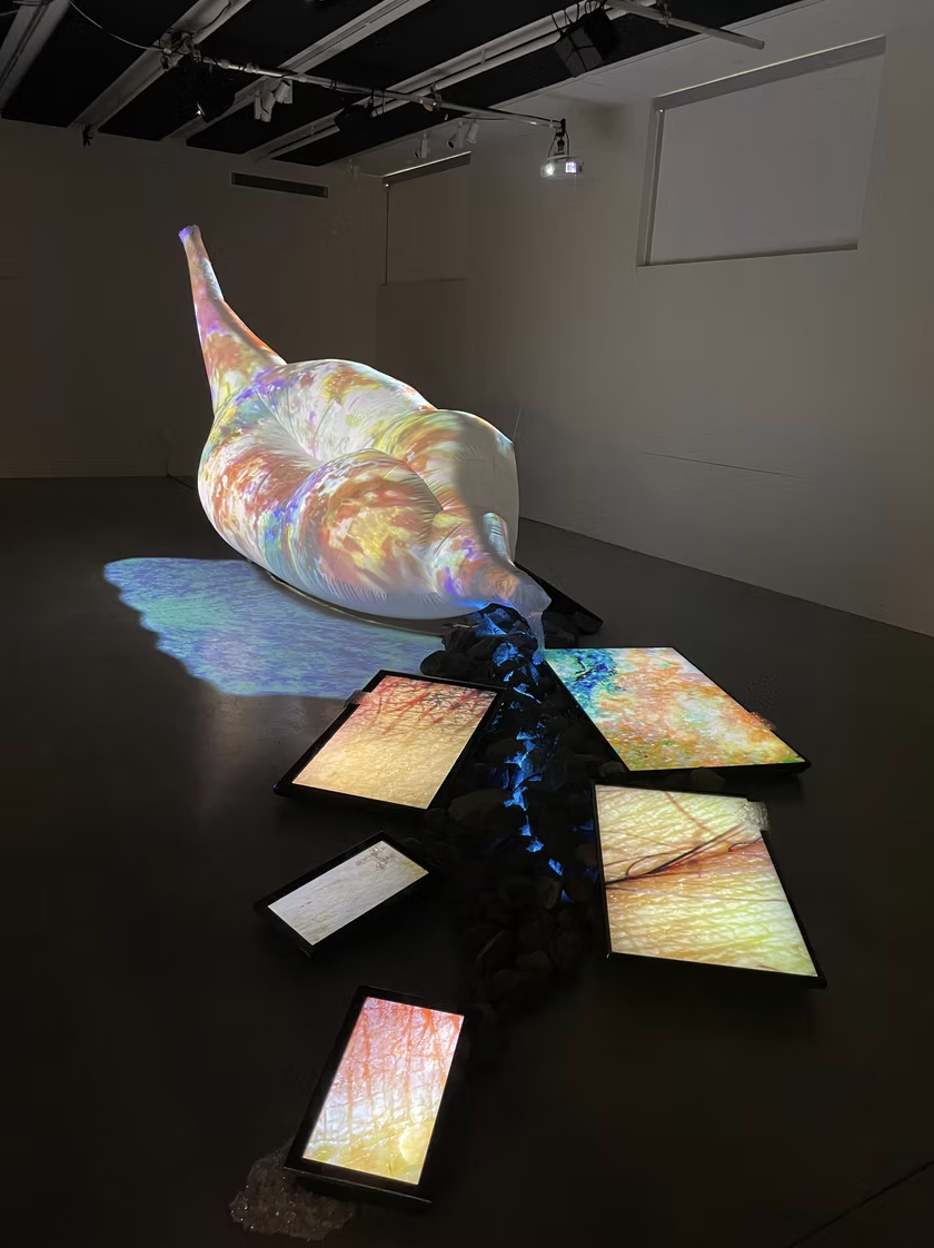 This installation is composed of video projection mapping onto a large inflatable textile sculpture, along with a set-up of multiple screen monitors, led lights, beading, rocks and spatialized sound. This virtual landscape explores skin as a territory comprised of layers of lived experiences and accumulated memories, which continuously shape and transform its topography. This work specifically reflects on how the skin of Bipoc individuals (similar to the natural landscape) carries the history of processes of colonialism: lineages of both oppression and resilience. This living membrane is then a terrain in itself, which transforms and adapts over time like a geographical ground.