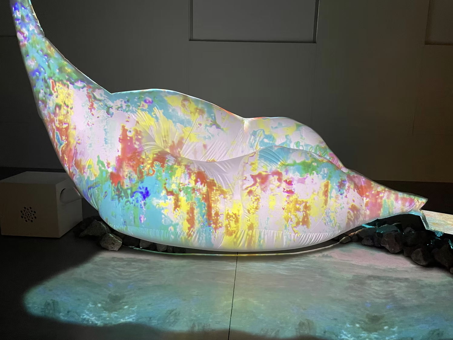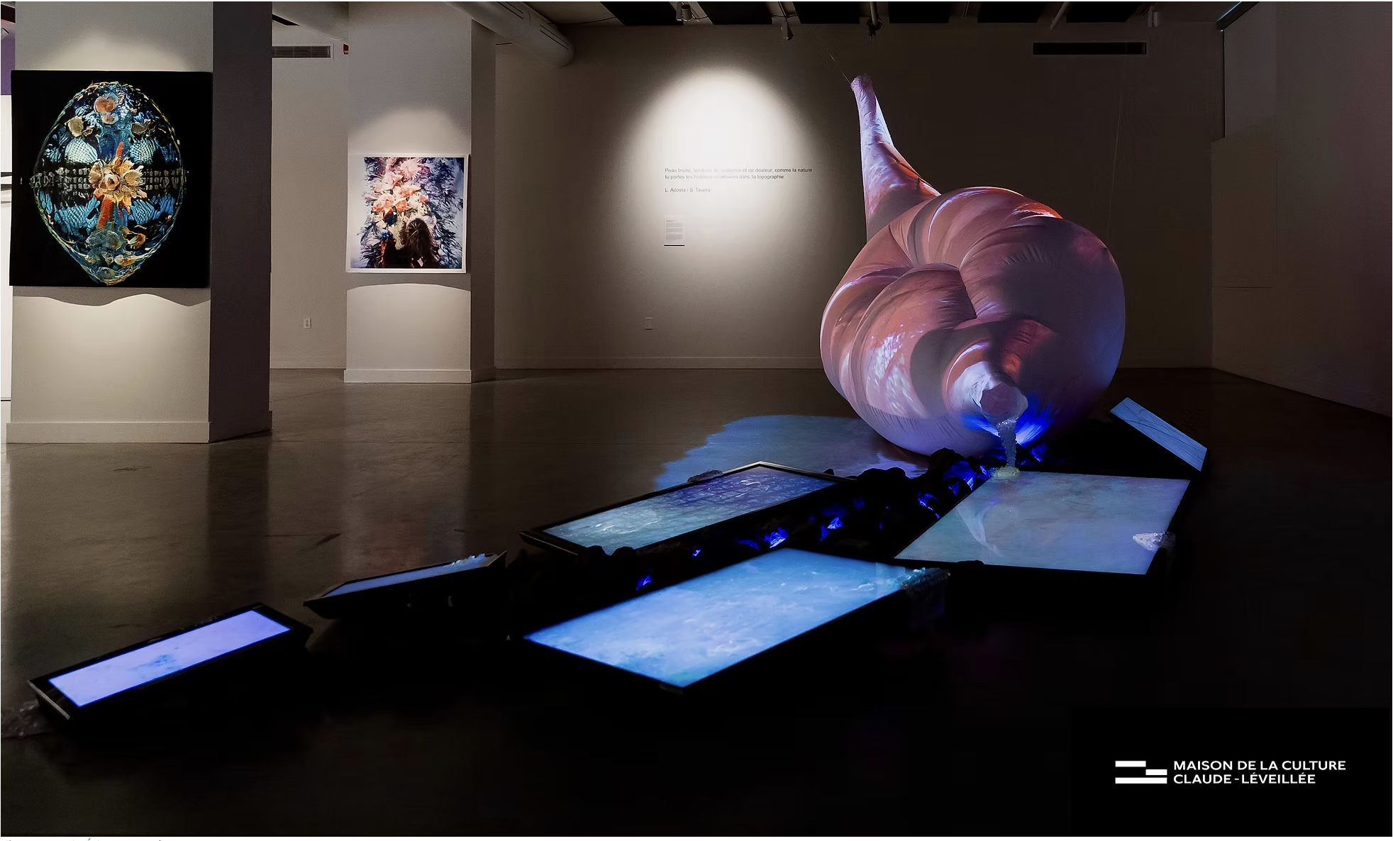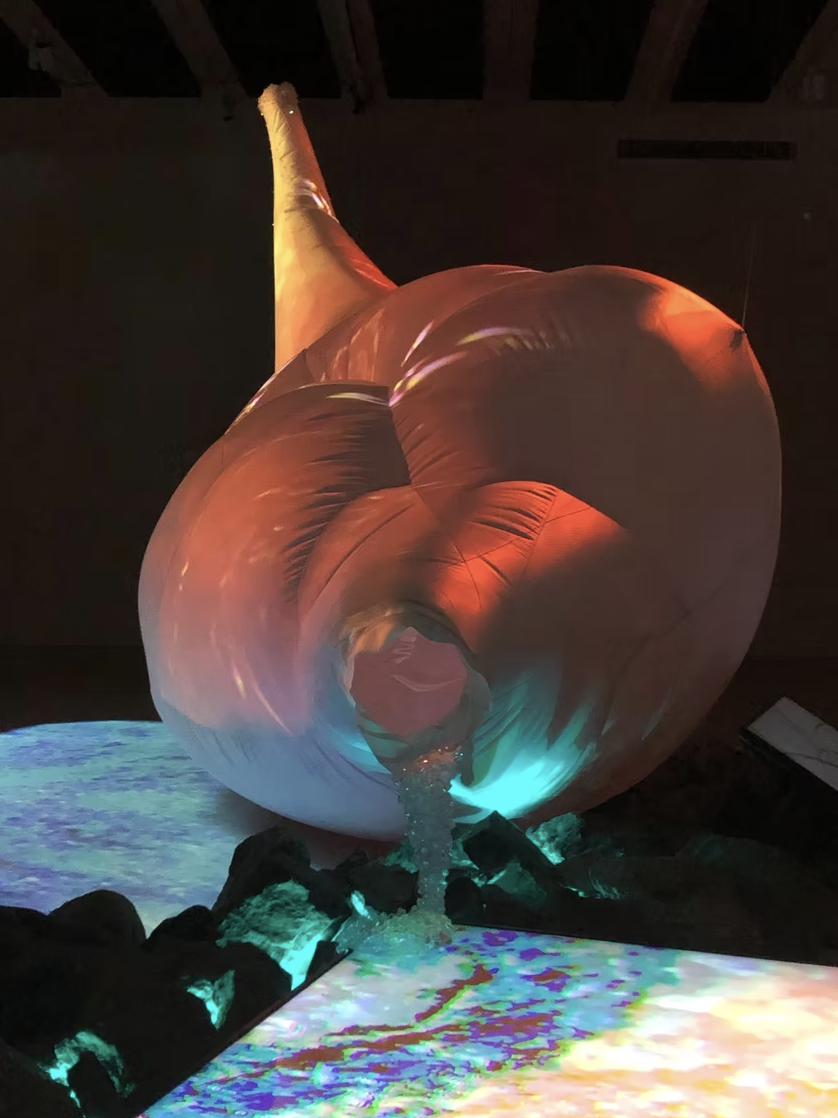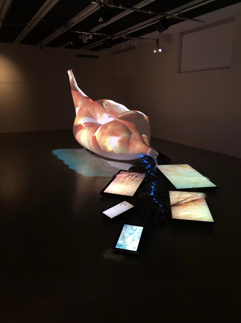 This installation is composed of video projection mapping onto a large inflatable textile sculpture, along with a set-up of multiple screen monitors, led lights, beading, rocks and spatialized sound. This virtual landscape explores skin as a territory comprised of layers of lived experiences and accumulated memories, which continuously shape and transform its topography. This work specifically reflects on how the skin of Bipoc individuals (similar to the natural landscape) carries the history of processes of colonialism: lineages of both oppression and resilience. This living membrane is then a terrain in itself, which transforms and adapts over time like a geographical ground.