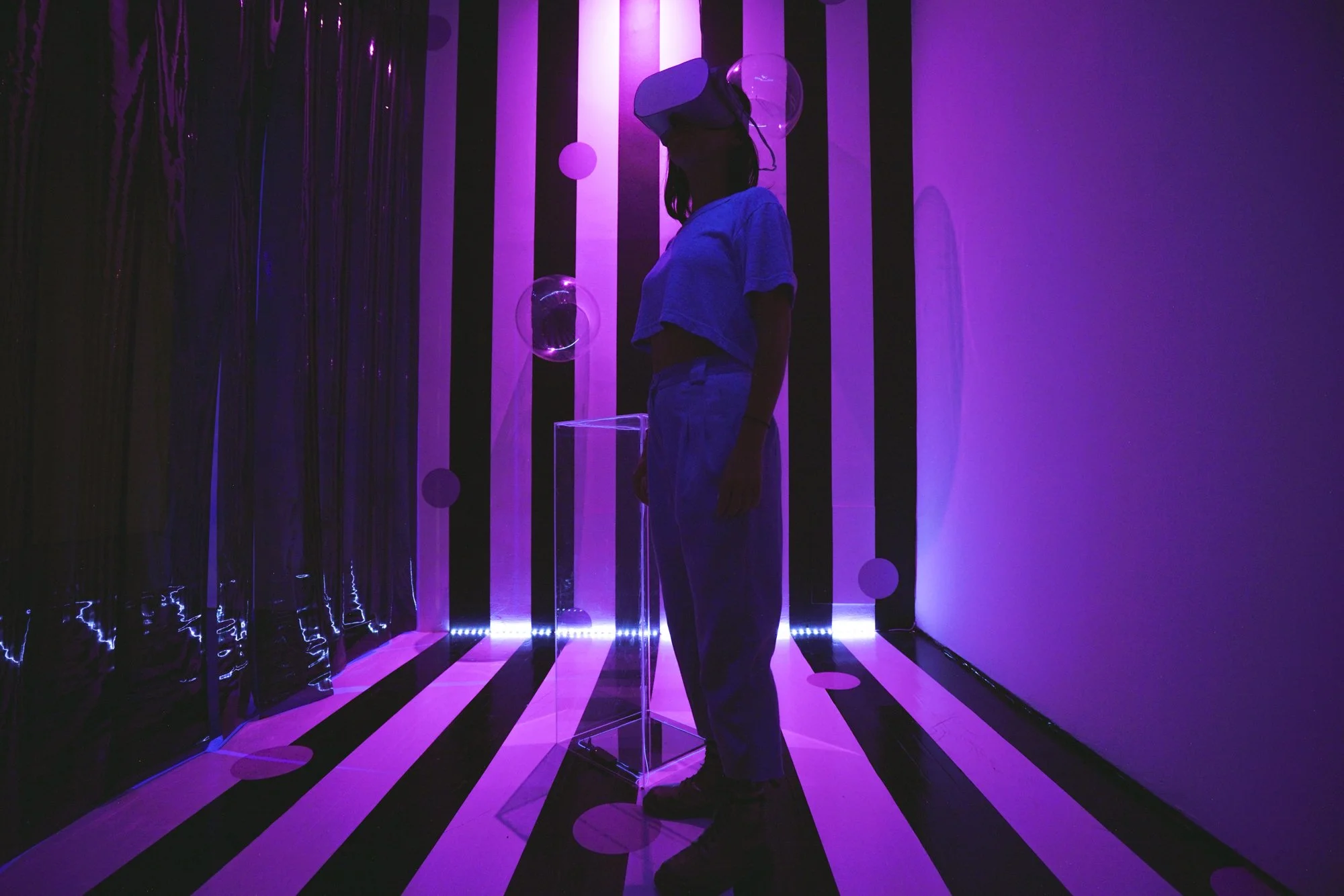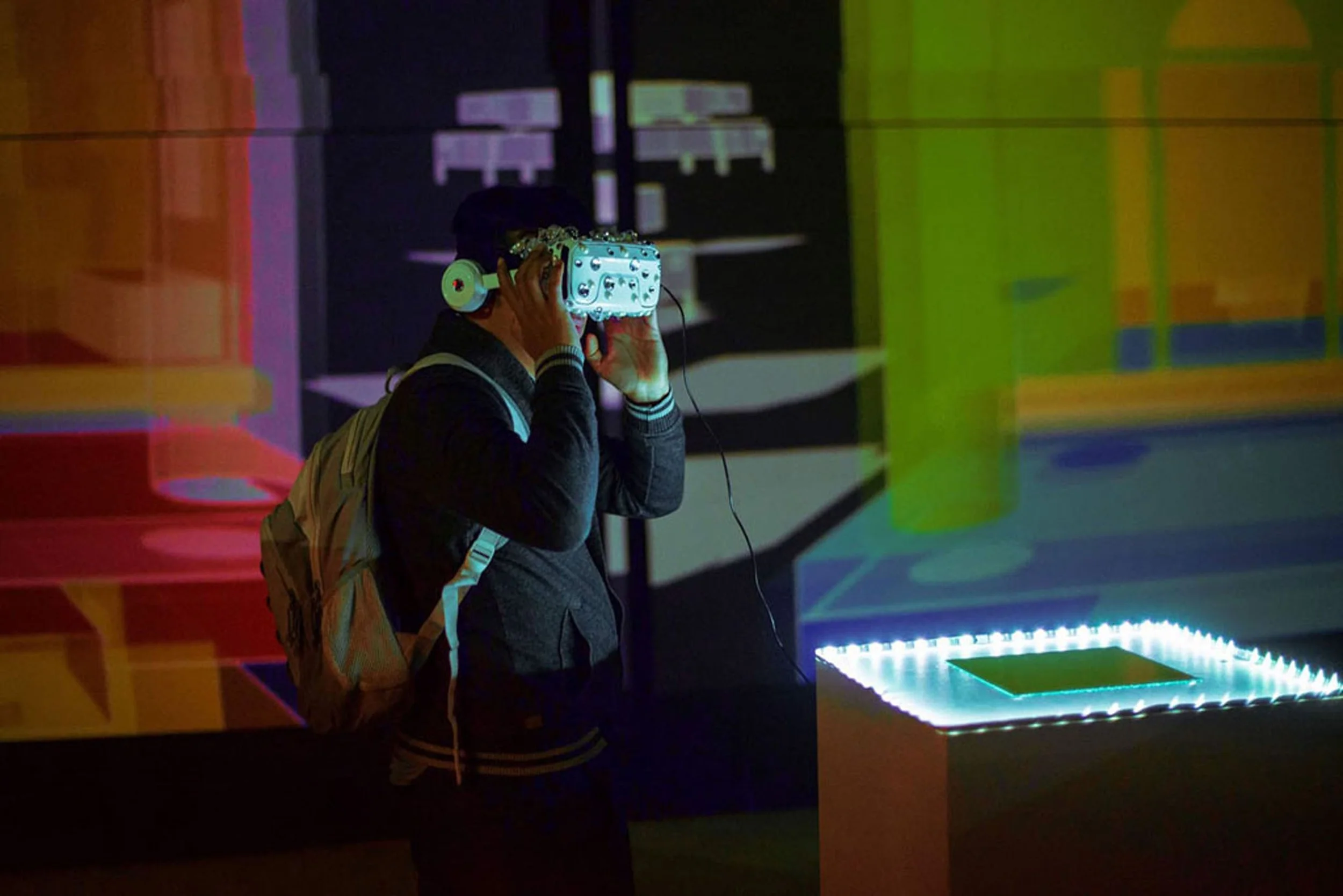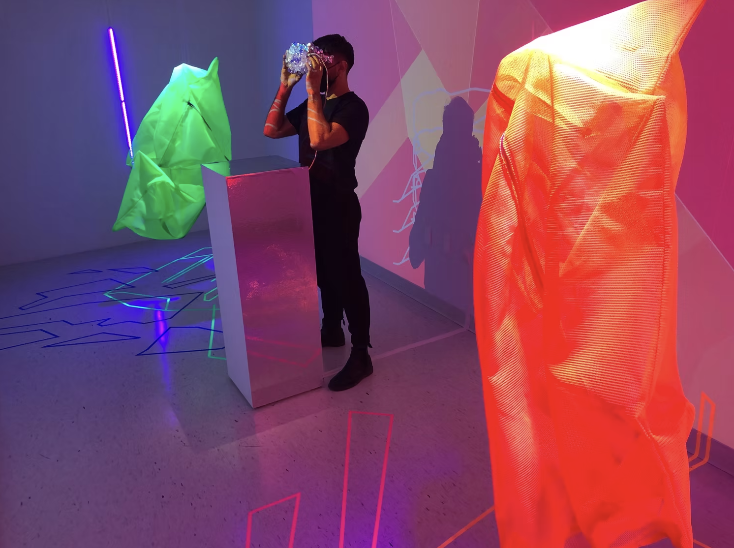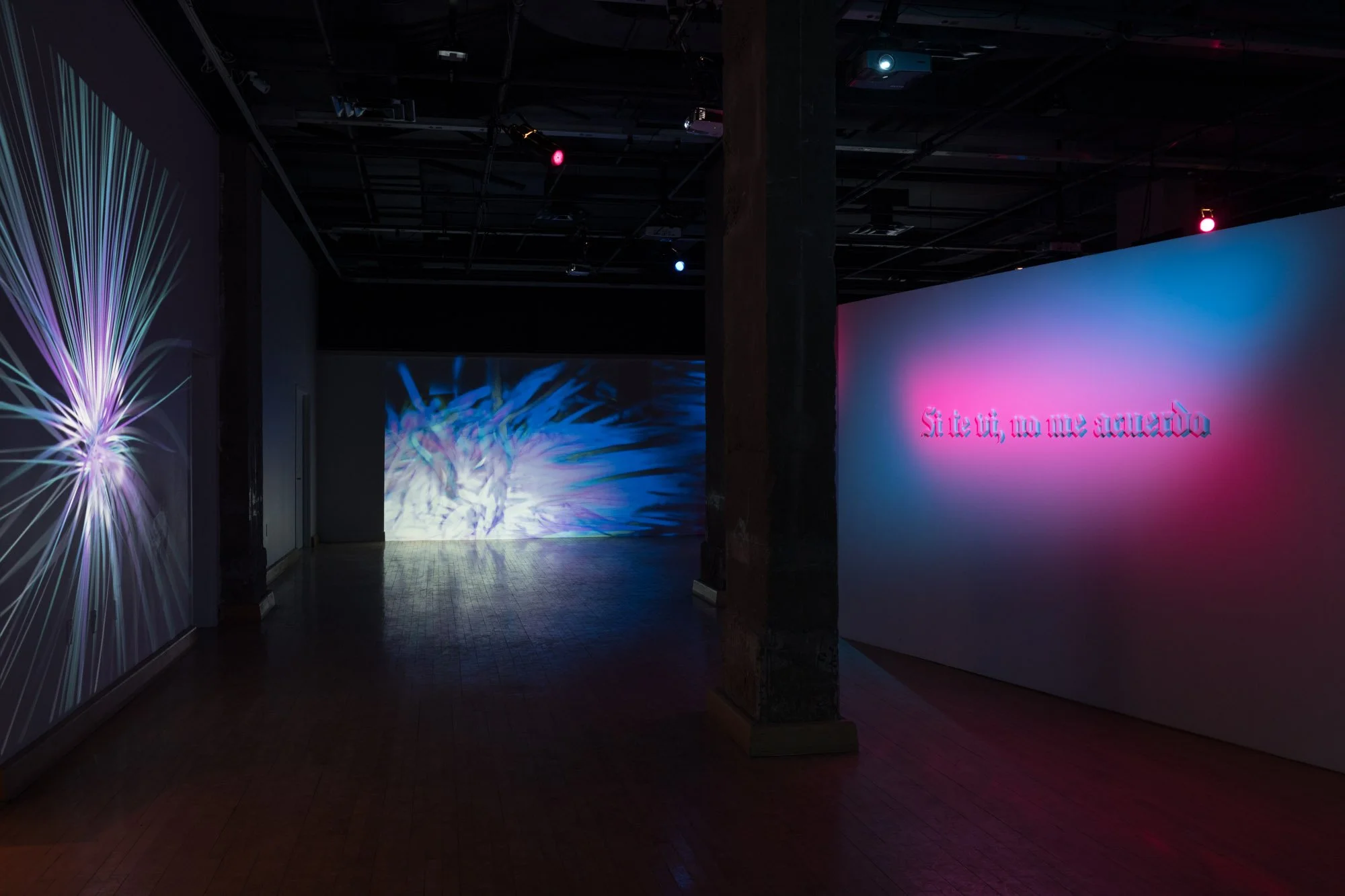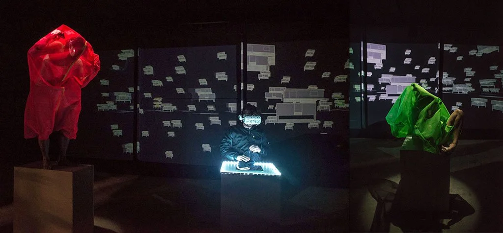 This installation combines virtual reality, video projections, lighting, digital animations, performance, textile sculptures, soundscapes and live security cameras to create an environment where repeated elements, including the presence of the viewers themselves, appear multiple times in both physical and virtual forms. This piece delves into how migrant and queer bodies are multiple and in constant translation across digital and geographical borders. In this ongoing process of displacement, the body inevitably longs to belong, going through more than a heartbreak: a despecho.