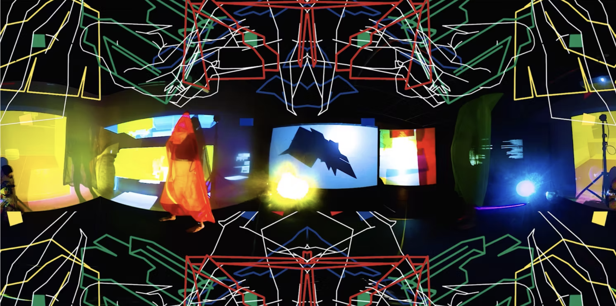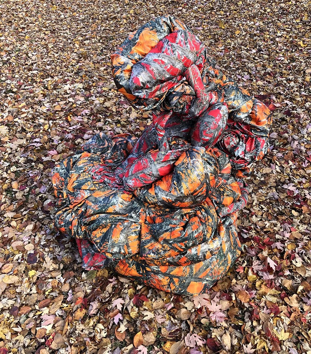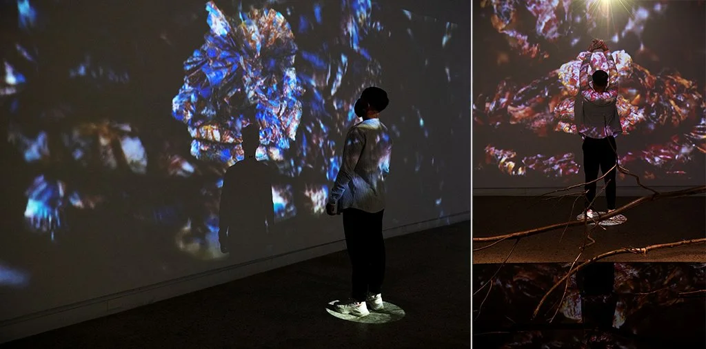 This interactive installation explores the (a)symbiotic relationship between us and the natural environment. This augmented cinematic experience incorporates large-scale panoramic video projections of a recorded performance with camouflaged textile pieces, along with motion sensors, enveloping soundscapes, lighting setups and sculptural elements. As the audience moves around the installation, their movements have the capacity to alter the images and sounds in the space, asking viewers to reflect on how their presence and actions have a direct effect on the environments that surround them. Camouflage here becomes an allegory not for hiding but rather for choosing how we are positioned in space in order to consciously relate to the environments we are part of.