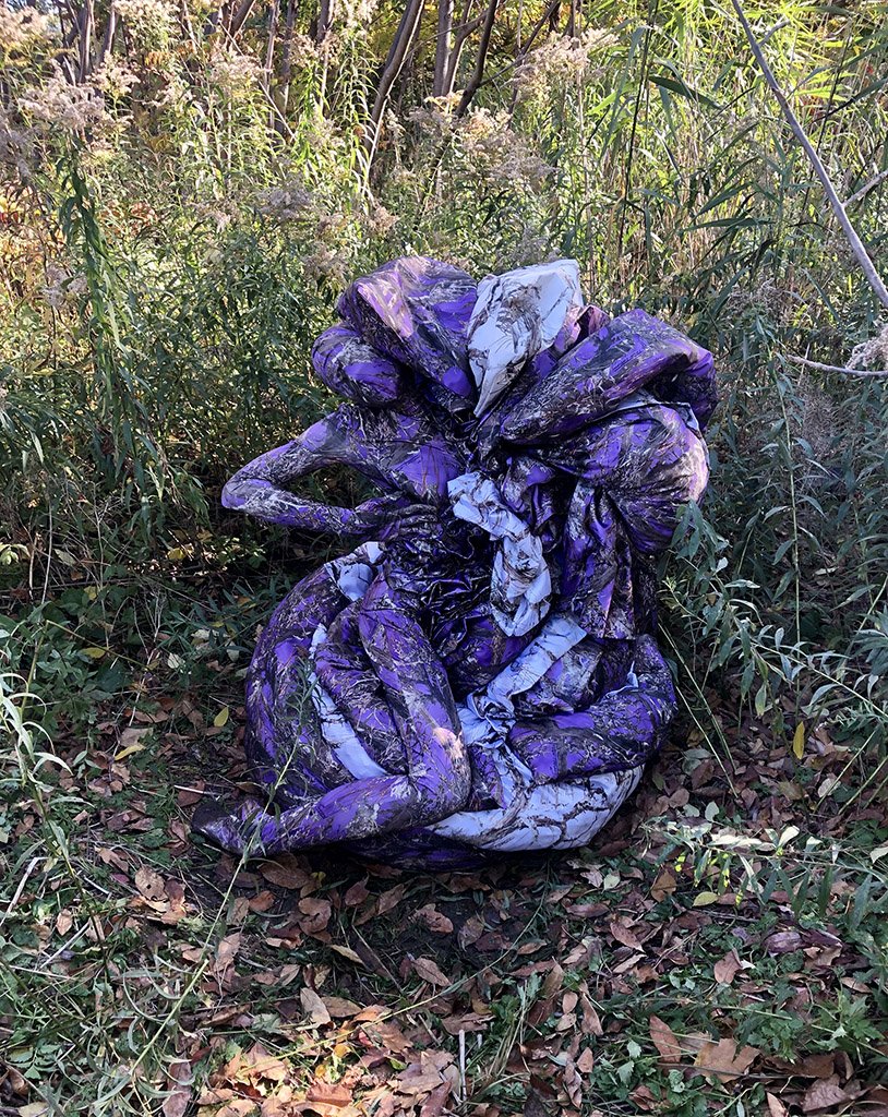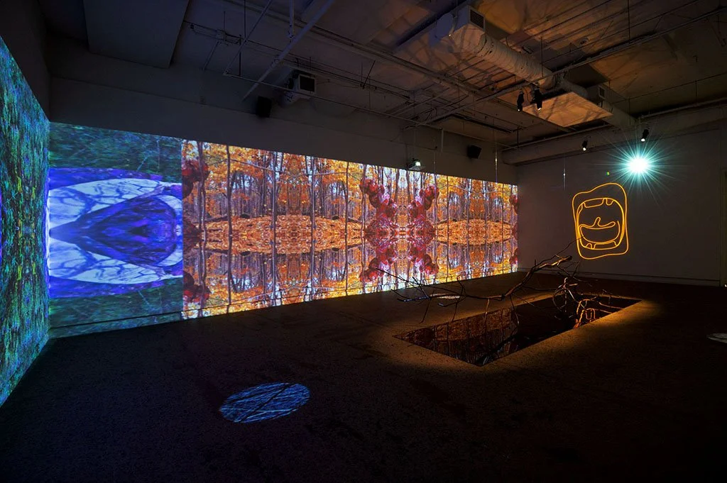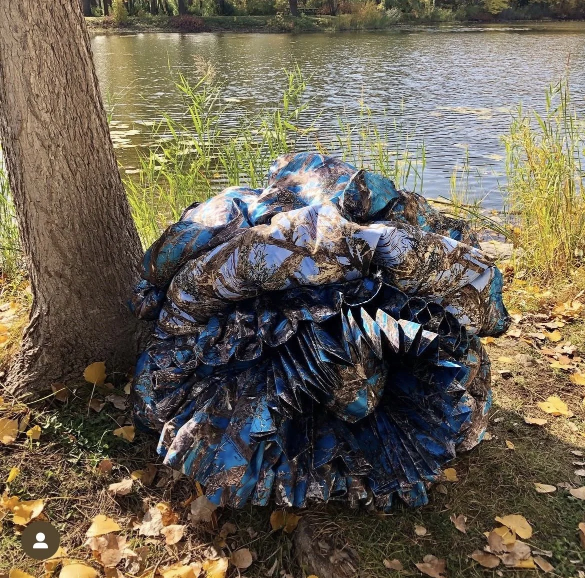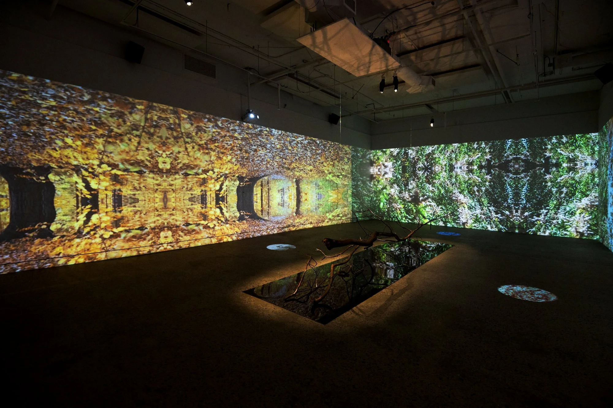 This interactive installation explores the (a)symbiotic relationship between us and the natural environment. This augmented cinematic experience incorporates large-scale panoramic video projections of a recorded performance with camouflaged textile pieces, along with motion sensors, enveloping soundscapes, lighting setups and sculptural elements. As the audience moves around the installation, their movements have the capacity to alter the images and sounds in the space, asking viewers to reflect on how their presence and actions have a direct effect on the environments that surround them. Camouflage here becomes an allegory not for hiding but rather for choosing how we are positioned in space in order to consciously relate to the environments we are part of.