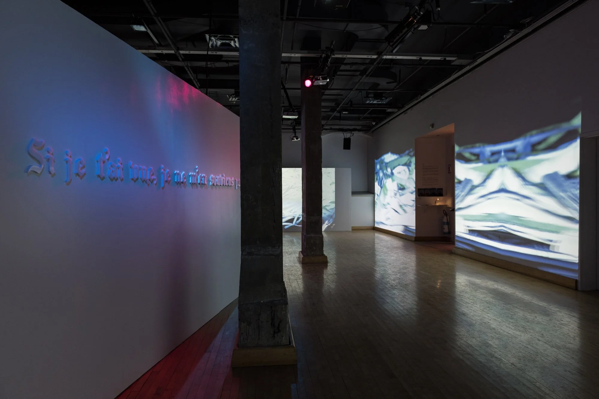 This immersive cinematic experience combines multiple video projections, holographic images, surround lighting, sculptural elements and spatialized soundscapes, to assemble a scenography of shifting architectures, where classical structures and elastic amorphous bodies are caught in a process of breaking appart. It explores the concept of rupture: how moments of fracture (within ourselves, our relationships or with the systems and environments we are part of) can become generative paths towards transformation and renewal.