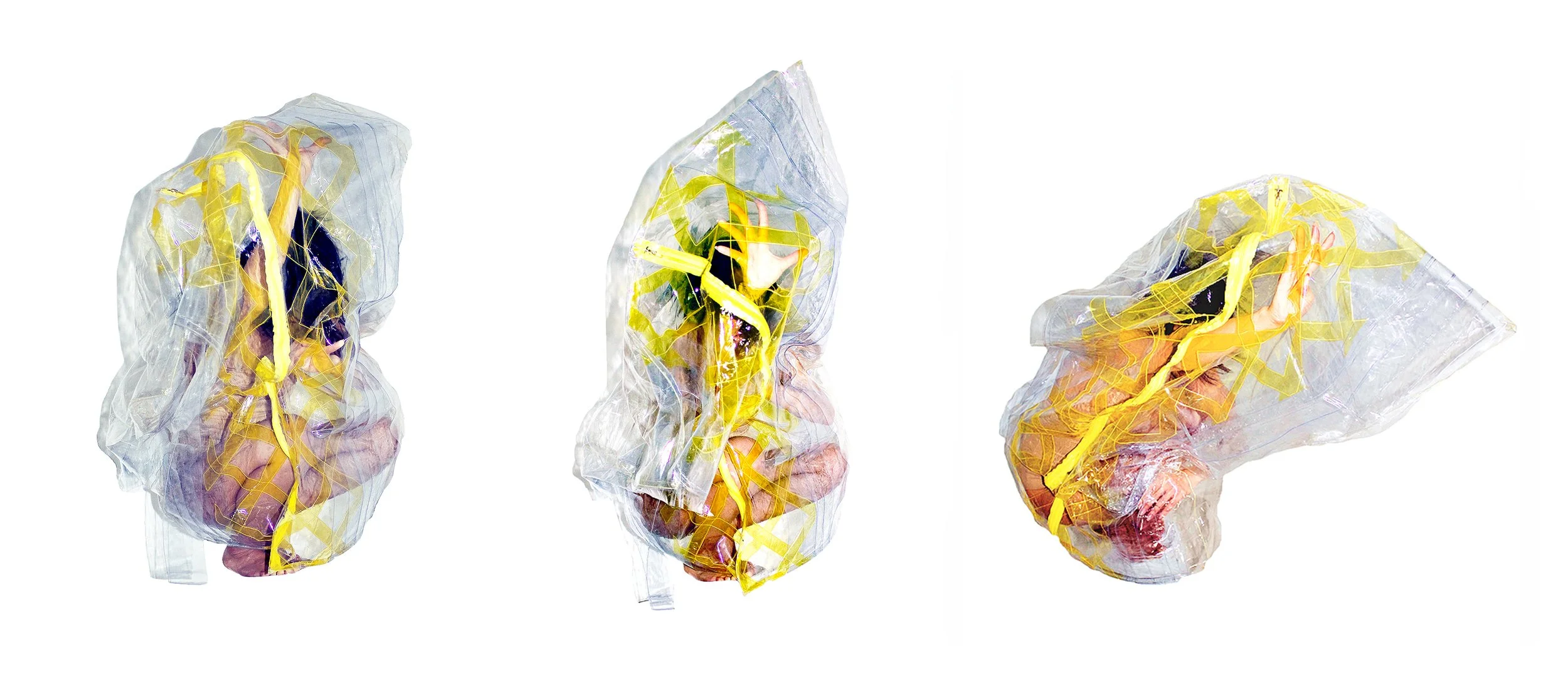 Empaquetada is a performance piece with wearable textiles that explores the notion of identity as packaging. Large vinyl structures envelop the body completely, as delicate yet malleable membranes that both protect and isolate. Their simple geometric and angular form becomes organic as the body moves within them, transforming them into unidentifiable shapes.